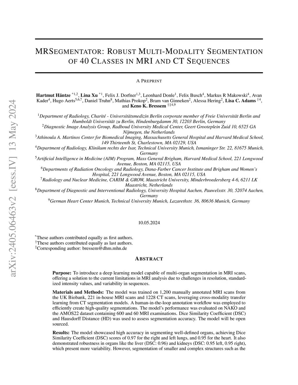Purpose: To introduce a deep learning model capable of multi-organ segmentation in MRI scans, offering a solution to the current limitations in MRI analysis due to challenges in resolution, standardized intensity values, and variability in sequences. Materials and Methods: he model was trained on 1,200 manually annotated MRI scans from the UK Biobank, 221 in-house MRI scans and 1228 CT scans, leveraging cross-modality transfer learning from CT segmentation models. A human-in-the-loop annotation workflow was employed to efficiently create high-quality segmentations. The model's performance was evaluated on NAKO and the AMOS22 dataset containing 600 and 60 MRI examinations. Dice Similarity Coefficient (DSC) and Hausdorff Distance (HD) was used to assess segmentation accuracy. The model will be open sourced. Results: The model showcased high accuracy in segmenting well-defined organs, achieving Dice Similarity Coefficient (DSC) scores of 0.97 for the right and left lungs, and 0.95 for the heart. It also demonstrated robustness in organs like the liver (DSC: 0.96) and kidneys (DSC: 0.95 left, 0.95 right), which present more variability. However, segmentation of smaller and complex structures such as the portal and splenic veins (DSC: 0.54) and adrenal glands (DSC: 0.65 left, 0.61 right) revealed the need for further model optimization. Conclusion: The proposed model is a robust, tool for accurate segmentation of 40 anatomical structures in MRI and CT images. By leveraging cross-modality learning and interactive annotation, the model achieves strong performance and generalizability across diverse datasets, making it a valuable resource for researchers and clinicians. It is open source and can be downloaded from https://github.com/hhaentze/MRSegmentator.