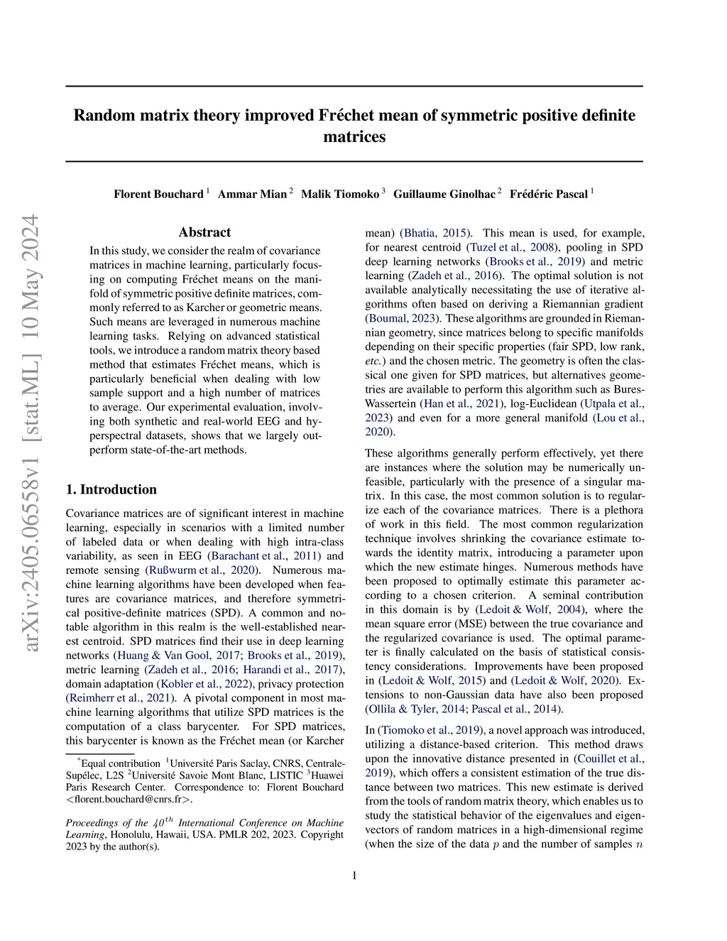 In this study, we consider the realm of covariance matrices in machine learning, particularly focusing on computing Fr\échet means on the manifold of symmetric positive definite matrices, commonly referred to as Karcher or geometric means. Such means are leveraged in numerous machine-learning tasks. Relying on advanced statistical tools, we introduce a random matrix theory-based method that estimates Fr\échet means, which is particularly beneficial when dealing with low sample support and a high number of matrices to average. Our experimental evaluation, involving both synthetic and real-world EEG and hyperspectral datasets, shows that we largely outperform state-of-the-art methods.
