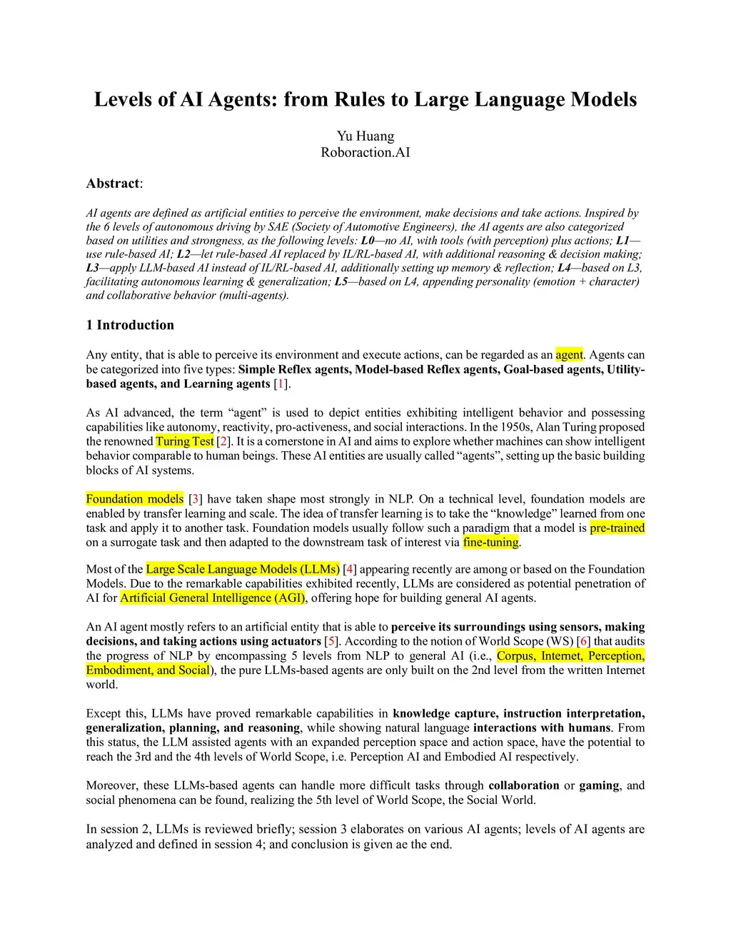 AI agents are defined as artificial entities to perceive the environment, make decisions and take actions. Inspired by the 6 levels of autonomous driving by Society of Automotive Engineers, the AI agents are also categorized based on utilities and strongness, as the following levels: L0, no AI, with tools taking into account perception plus actions; L1, using rule-based AI; L2, making rule-based AI replaced by IL/RL-based AI, with additional reasoning & decision making; L3, applying LLM-based AI instead of IL/RL-based AI, additionally setting up memory & reflection; L4, based on L3, facilitating autonomous learning & generalization; L5, based on L4, appending personality of emotion and character and collaborative behavior with multi-agents.