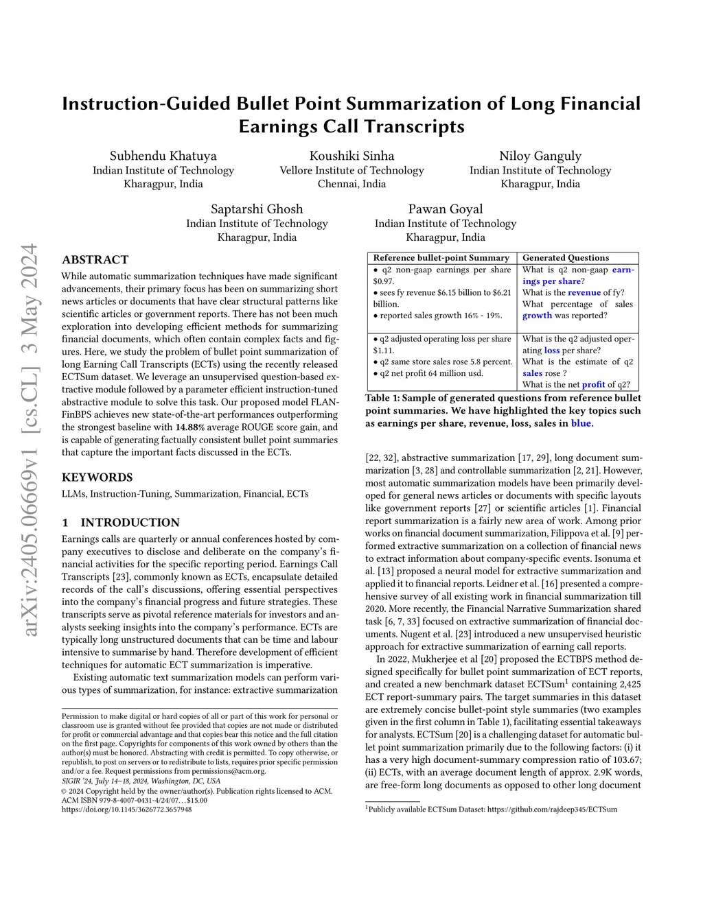 While automatic summarization techniques have made significant advancements, their primary focus has been on summarizing short news articles or documents that have clear structural patterns like scientific articles or government reports. There has not been much exploration into developing efficient methods for summarizing financial documents, which often contain complex facts and figures. Here, we study the problem of bullet point summarization of long Earning Call Transcripts (ECTs) using the recently released ECTSum dataset. We leverage an unsupervised question-based extractive module followed by a parameter efficient instruction-tuned abstractive module to solve this task. Our proposed model FLAN-FinBPS achieves new state-of-the-art performances outperforming the strongest baseline with 14.88% average ROUGE score gain, and is capable of generating factually consistent bullet point summaries that capture the important facts discussed in the ECTs.