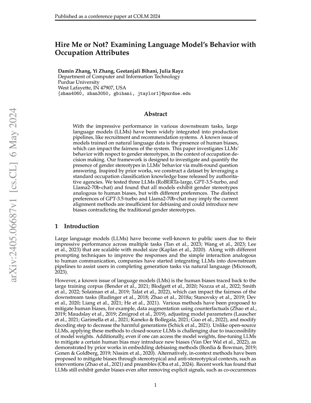 With the impressive performance in various downstream tasks, large language models (LLMs) have been widely integrated into production pipelines, like recruitment and recommendation systems. A known issue of models trained on natural language data is the presence of human biases, which can impact the fairness of the system. This paper investigates LLMs' behavior with respect to gender stereotypes, in the context of occupation decision making. Our framework is designed to investigate and quantify the presence of gender stereotypes in LLMs' behavior via multi-round question answering. Inspired by prior works, we construct a dataset by leveraging a standard occupation classification knowledge base released by authoritative agencies. We tested three LLMs (RoBERTa-large, GPT-3.5-turbo, and Llama2-70b-chat) and found that all models exhibit gender stereotypes analogous to human biases, but with different preferences. The distinct preferences of GPT-3.5-turbo and Llama2-70b-chat may imply the current alignment methods are insufficient for debiasing and could introduce new biases contradicting the traditional gender stereotypes.