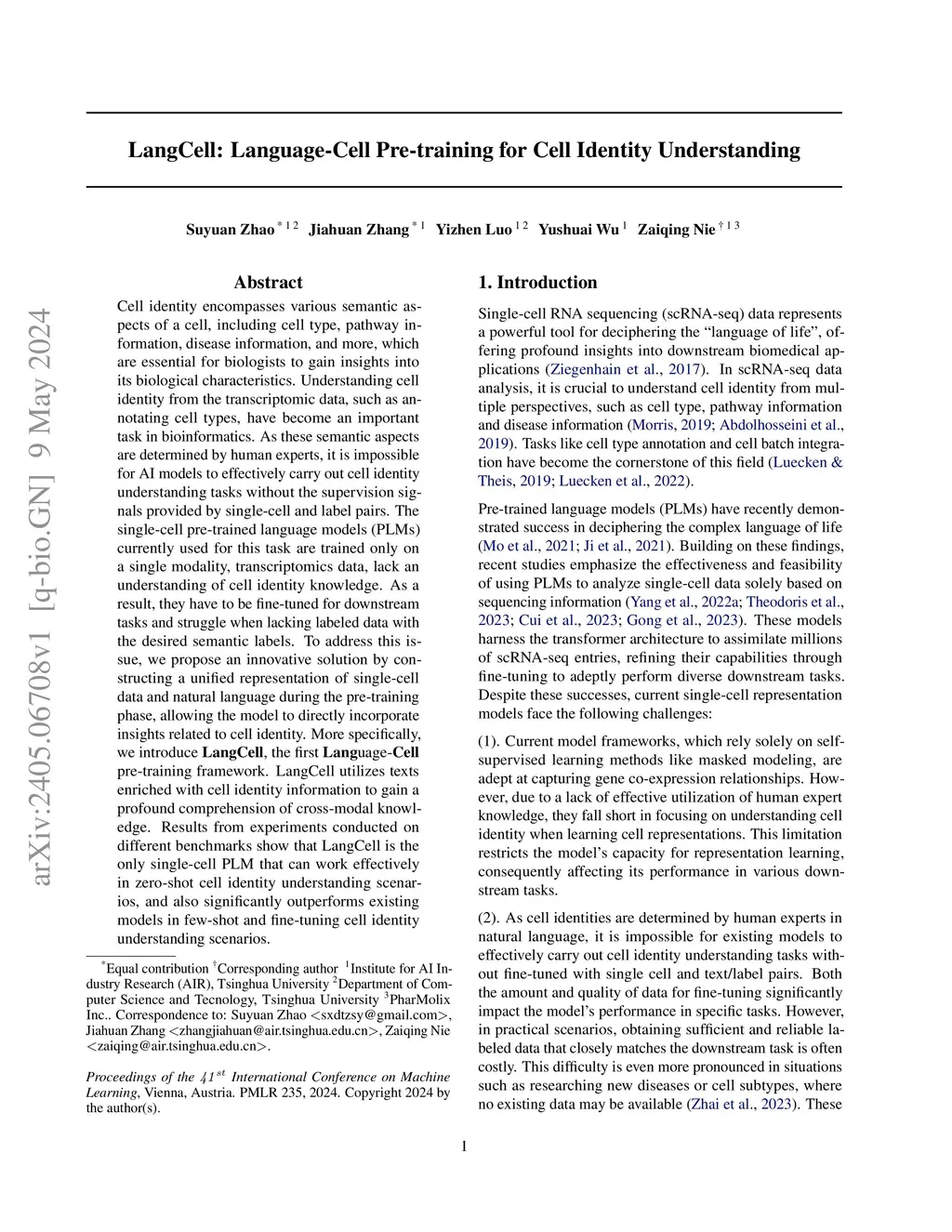 Cell identity encompasses various semantic aspects of a cell, including cell type, pathway information, disease information, and more, which are essential for biologists to gain insights into its biological characteristics. Understanding cell identity from the transcriptomic data, such as annotating cell types, have become an important task in bioinformatics. As these semantic aspects are determined by human experts, it is impossible for AI models to effectively carry out cell identity understanding tasks without the supervision signals provided by single-cell and label pairs. The single-cell pre-trained language models (PLMs) currently used for this task are trained only on a single modality, transcriptomics data, lack an understanding of cell identity knowledge. As a result, they have to be fine-tuned for downstream tasks and struggle when lacking labeled data with the desired semantic labels. To address this issue, we propose an innovative solution by constructing a unified representation of single-cell data and natural language during the pre-training phase, allowing the model to directly incorporate insights related to cell identity. More specifically, we introduce LangCell, the first Language-Cell pre-training framework. LangCell utilizes texts enriched with cell identity information to gain a profound comprehension of cross-modal knowledge. Results from experiments conducted on different benchmarks show that LangCell is the only single-cell PLM that can work effectively in zero-shot cell identity understanding scenarios, and also significantly outperforms existing models in few-shot and fine-tuning cell identity understanding scenarios.