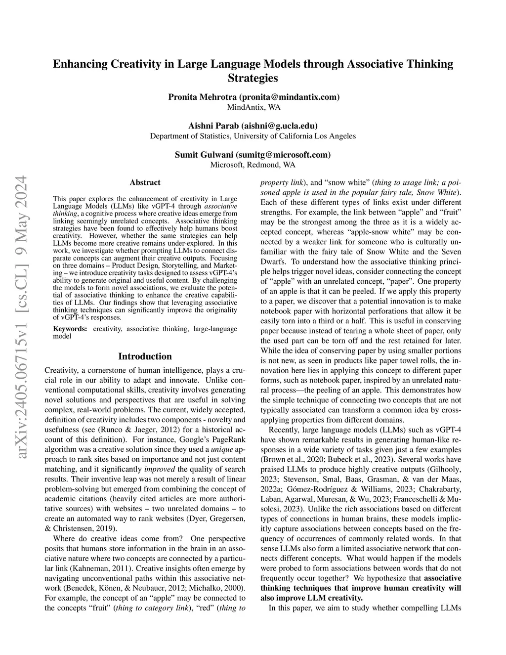 This paper explores the enhancement of creativity in Large Language Models (LLMs) like vGPT-4 through associative thinking, a cognitive process where creative ideas emerge from linking seemingly unrelated concepts. Associative thinking strategies have been found to effectively help humans boost creativity. However, whether the same strategies can help LLMs become more creative remains under-explored. In this work, we investigate whether prompting LLMs to connect disparate concepts can augment their creative outputs. Focusing on three domains -- Product Design, Storytelling, and Marketing -- we introduce creativity tasks designed to assess vGPT-4's ability to generate original and useful content. By challenging the models to form novel associations, we evaluate the potential of associative thinking to enhance the creative capabilities of LLMs. Our findings show that leveraging associative thinking techniques can significantly improve the originality of vGPT-4's responses.