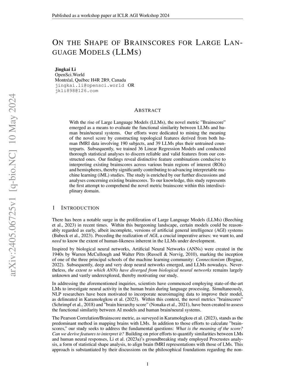 With the rise of Large Language Models (LLMs), the novel metric "Brainscore" emerged as a means to evaluate the functional similarity between LLMs and human brain/neural systems. Our efforts were dedicated to mining the meaning of the novel score by constructing topological features derived from both human fMRI data involving 190 subjects, and 39 LLMs plus their untrained counterparts. Subsequently, we trained 36 Linear Regression Models and conducted thorough statistical analyses to discern reliable and valid features from our constructed ones. Our findings reveal distinctive feature combinations conducive to interpreting existing brainscores across various brain regions of interest (ROIs) and hemispheres, thereby significantly contributing to advancing interpretable machine learning (iML) studies. The study is enriched by our further discussions and analyses concerning existing brainscores. To our knowledge, this study represents the first attempt to comprehend the novel metric brainscore within this interdisciplinary domain.