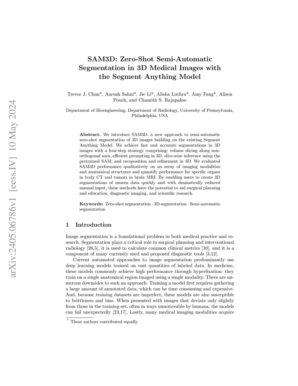 We introduce SAM3D, a new approach to semi-automatic zero-shot segmentation of 3D images building on the existing Segment Anything Model. We achieve fast and accurate segmentations in 3D images with a four-step strategy comprising: volume slicing along non-orthogonal axes, efficient prompting in 3D, slice-wise inference using the pretrained SAM, and recoposition and refinement in 3D. We evaluated SAM3D performance qualitatively on an array of imaging modalities and anatomical structures and quantify performance for specific organs in body CT and tumors in brain MRI. By enabling users to create 3D segmentations of unseen data quickly and with dramatically reduced manual input, these methods have the potential to aid surgical planning and education, diagnostic imaging, and scientific research.