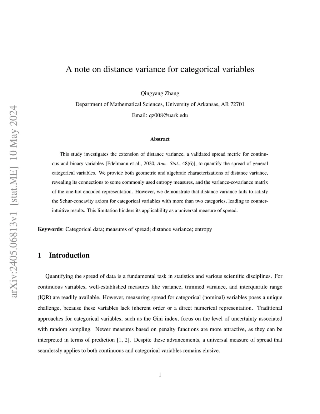 This study investigates the extension of distance variance, a validated spread metric for continuous and binary variables [Edelmann et al., 2020, Ann. Stat., 48(6)], to quantify the spread of general categorical variables. We provide both geometric and algebraic characterizations of distance variance, revealing its connections to some commonly used entropy measures, and the variance-covariance matrix of the one-hot encoded representation. However, we demonstrate that distance variance fails to satisfy the Schur-concavity axiom for categorical variables with more than two categories, leading to counterintuitive results. This limitation hinders its applicability as a universal measure of spread.