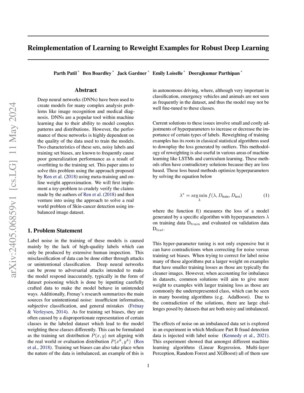 Deep neural networks (DNNs) have been used to create models for many complex analysis problems like image recognition and medical diagnosis. DNNs are a popular tool within machine learning due to their ability to model complex patterns and distributions. However, the performance of these networks is highly dependent on the quality of the data used to train the models. Two characteristics of these sets, noisy labels and training set biases, are known to frequently cause poor generalization performance as a result of overfitting to the training set. This paper aims to solve this problem using the approach proposed by Ren et al. (2018) using meta-training and online weight approximation. We will first implement a toy-problem to crudely verify the claims made by the authors of Ren et al. (2018) and then venture into using the approach to solve a real world problem of Skin-cancer detection using an imbalanced image dataset.