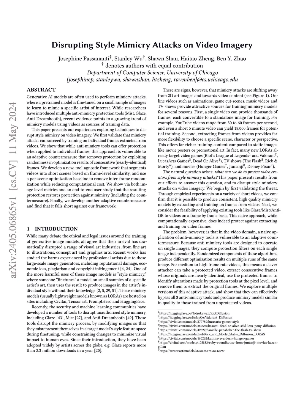 Disrupting Style Mimicry Attacks on Video Imagery