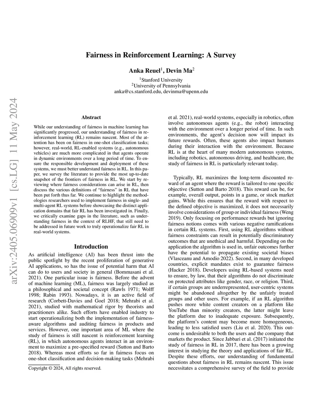 While our understanding of fairness in machine learning has significantly progressed, our understanding of fairness in reinforcement learning (RL) remains nascent. Most of the attention has been on fairness in one-shot classification tasks; however, real-world, RL-enabled systems (e.g., autonomous vehicles) are much more complicated in that agents operate in dynamic environments over a long period of time. To ensure the responsible development and deployment of these systems, we must better understand fairness in RL. In this paper, we survey the literature to provide the most up-to-date snapshot of the frontiers of fairness in RL. We start by reviewing where fairness considerations can arise in RL, then discuss the various definitions of fairness in RL that have been put forth thus far. We continue to highlight the methodologies researchers used to implement fairness in single- and multi-agent RL systems before showcasing the distinct application domains that fair RL has been investigated in. Finally, we critically examine gaps in the literature, such as understanding fairness in the context of RLHF, that still need to be addressed in future work to truly operationalize fair RL in real-world systems.