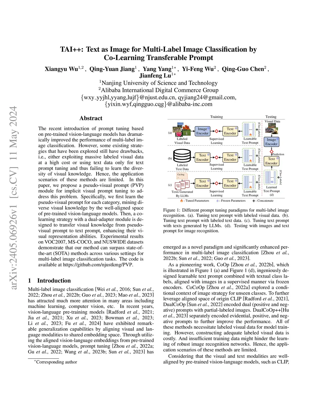 The recent introduction of prompt tuning based on pre-trained vision-language models has dramatically improved the performance of multi-label image classification. However, some existing strategies that have been explored still have drawbacks, i.e., either exploiting massive labeled visual data at a high cost or using text data only for text prompt tuning and thus failing to learn the diversity of visual knowledge. Hence, the application scenarios of these methods are limited. In this paper, we propose a pseudo-visual prompt~(PVP) module for implicit visual prompt tuning to address this problem. Specifically, we first learn the pseudo-visual prompt for each category, mining diverse visual knowledge by the well-aligned space of pre-trained vision-language models. Then, a co-learning strategy with a dual-adapter module is designed to transfer visual knowledge from pseudo-visual prompt to text prompt, enhancing their visual representation abilities. Experimental results on VOC2007, MS-COCO, and NUSWIDE datasets demonstrate that our method can surpass state-of-the-art~(SOTA) methods across various settings for multi-label image classification tasks. The code is available at https://github.com/njustkmg/PVP.