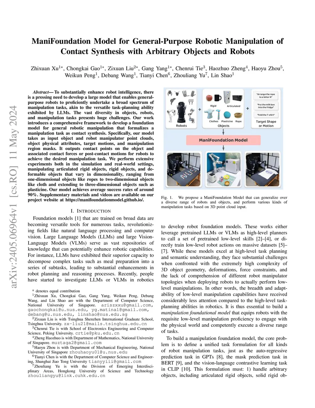 To substantially enhance robot intelligence, there is a pressing need to develop a large model that enables general-purpose robots to proficiently undertake a broad spectrum of manipulation tasks, akin to the versatile task-planning ability exhibited by LLMs. The vast diversity in objects, robots, and manipulation tasks presents huge challenges. Our work introduces a comprehensive framework to develop a foundation model for general robotic manipulation that formalizes a manipulation task as contact synthesis. Specifically, our model takes as input object and robot manipulator point clouds, object physical attributes, target motions, and manipulation region masks. It outputs contact points on the object and associated contact forces or post-contact motions for robots to achieve the desired manipulation task. We perform extensive experiments both in the simulation and real-world settings, manipulating articulated rigid objects, rigid objects, and deformable objects that vary in dimensionality, ranging from one-dimensional objects like ropes to two-dimensional objects like cloth and extending to three-dimensional objects such as plasticine. Our model achieves average success rates of around 90\%. Supplementary materials and videos are available on our project website at https://manifoundationmodel.github.io/.