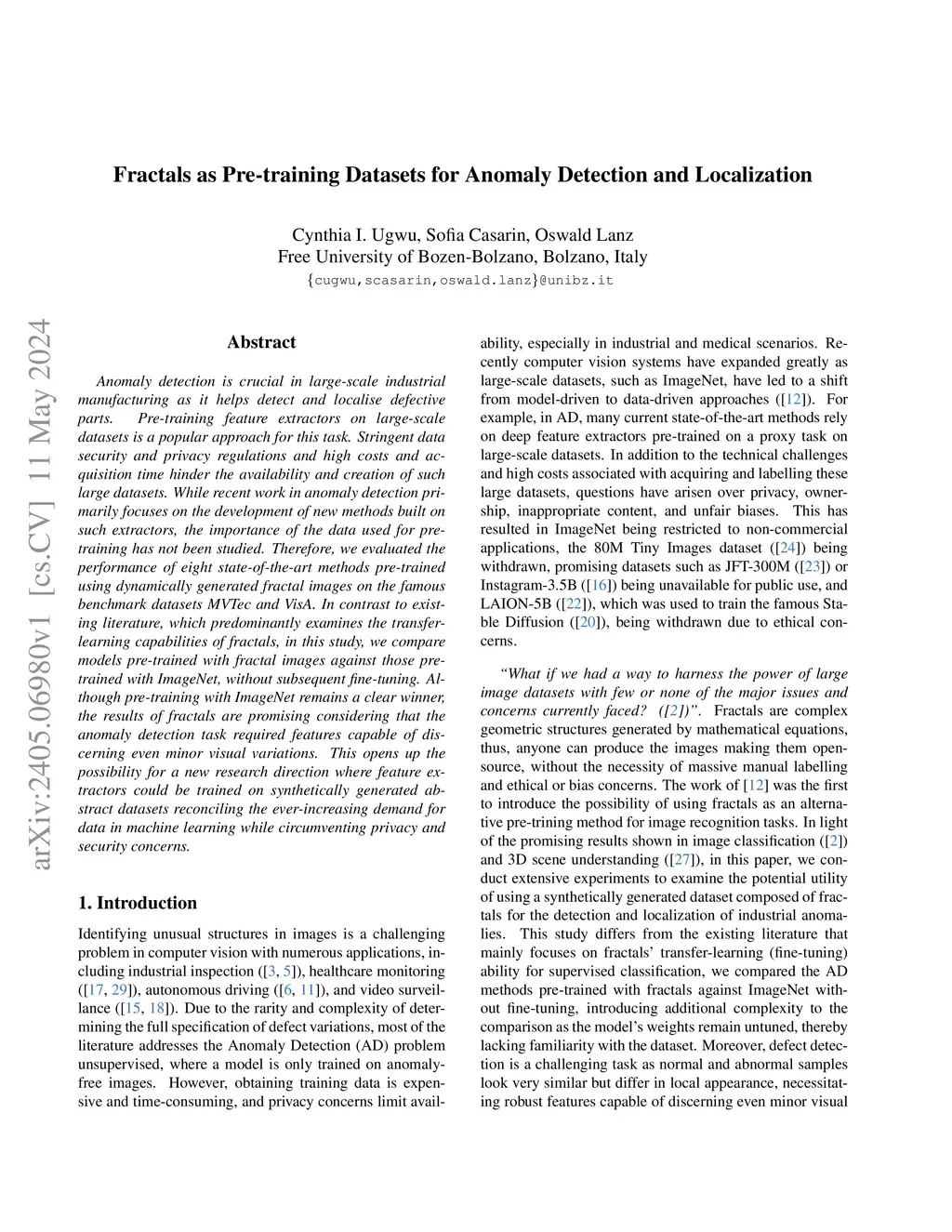 Fractals as Pre-training Datasets for Anomaly Detection and Localization