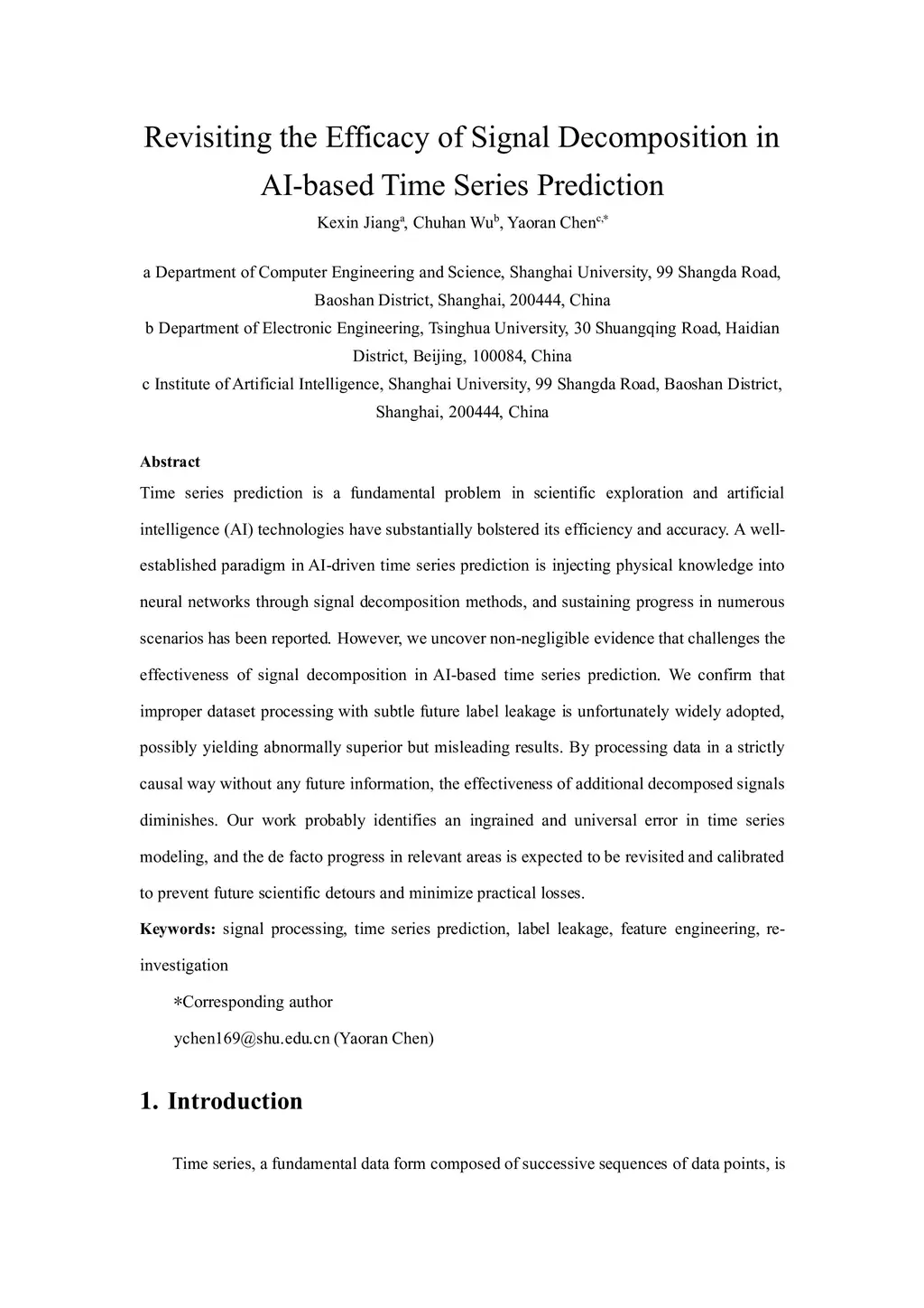 Time series prediction is a fundamental problem in scientific exploration and artificial intelligence (AI) technologies have substantially bolstered its efficiency and accuracy. A well-established paradigm in AI-driven time series prediction is injecting physical knowledge into neural networks through signal decomposition methods, and sustaining progress in numerous scenarios has been reported. However, we uncover non-negligible evidence that challenges the effectiveness of signal decomposition in AI-based time series prediction. We confirm that improper dataset processing with subtle future label leakage is unfortunately widely adopted, possibly yielding abnormally superior but misleading results. By processing data in a strictly causal way without any future information, the effectiveness of additional decomposed signals diminishes. Our work probably identifies an ingrained and universal error in time series modeling, and the de facto progress in relevant areas is expected to be revisited and calibrated to prevent future scientific detours and minimize practical losses.