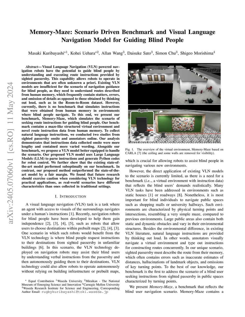 Memory-Maze: Scenario Driven Visual Language Navigation Benchmark for Guiding Blind People