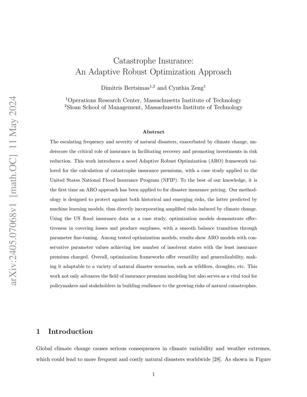 The escalating frequency and severity of natural disasters, exacerbated by climate change, underscore the critical role of insurance in facilitating recovery and promoting investments in risk reduction. This work introduces a novel Adaptive Robust Optimization (ARO) framework tailored for the calculation of catastrophe insurance premiums, with a case study applied to the United States National Flood Insurance Program (NFIP). To the best of our knowledge, it is the first time an ARO approach has been applied to for disaster insurance pricing. Our methodology is designed to protect against both historical and emerging risks, the latter predicted by machine learning models, thus directly incorporating amplified risks induced by climate change. Using the US flood insurance data as a case study, optimization models demonstrate effectiveness in covering losses and produce surpluses, with a smooth balance transition through parameter fine-tuning. Among tested optimization models, results show ARO models with conservative parameter values achieving low number of insolvent states with the least insurance premium charged. Overall, optimization frameworks offer versatility and generalizability, making it adaptable to a variety of natural disaster scenarios, such as wildfires, droughts, etc. This work not only advances the field of insurance premium modeling but also serves as a vital tool for policymakers and stakeholders in building resilience to the growing risks of natural catastrophes.