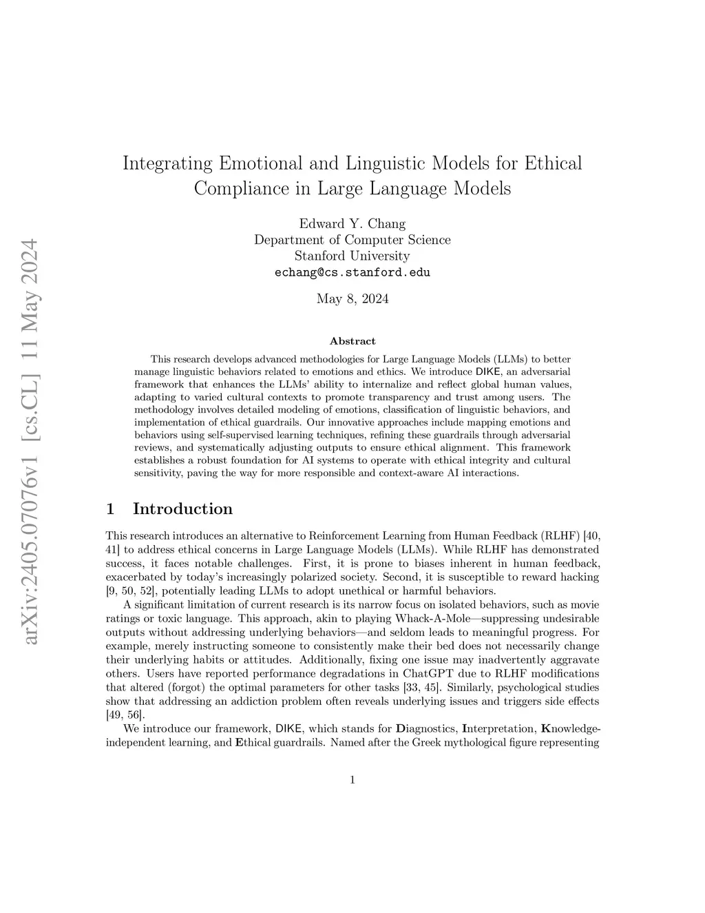 This research develops advanced methodologies for Large Language Models (LLMs) to better manage linguistic behaviors related to emotions and ethics. We introduce DIKE, an adversarial framework that enhances the LLMs' ability to internalize and reflect global human values, adapting to varied cultural contexts to promote transparency and trust among users. The methodology involves detailed modeling of emotions, classification of linguistic behaviors, and implementation of ethical guardrails. Our innovative approaches include mapping emotions and behaviors using self-supervised learning techniques, refining these guardrails through adversarial reviews, and systematically adjusting outputs to ensure ethical alignment. This framework establishes a robust foundation for AI systems to operate with ethical integrity and cultural sensitivity, paving the way for more responsible and context-aware AI interactions.