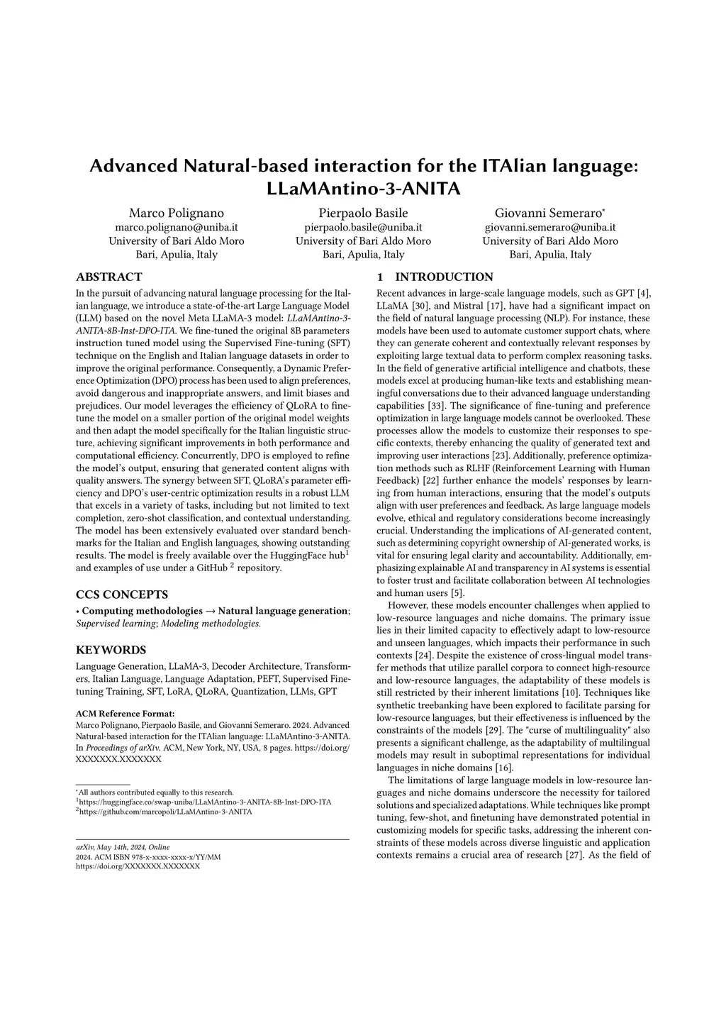 In the pursuit of advancing natural language processing for the Italian language, we introduce a state-of-the-art Large Language Model (LLM) based on the novel Meta LLaMA-3 model: LLaMAntino-3-ANITA-8B-Inst-DPO-ITA. We fine-tuned the original 8B parameters instruction tuned model using the Supervised Fine-tuning (SFT) technique on the English and Italian language datasets in order to improve the original performance. Consequently, a Dynamic Preference Optimization (DPO) process has been used to align preferences, avoid dangerous and inappropriate answers, and limit biases and prejudices. Our model leverages the efficiency of QLoRA to fine-tune the model on a smaller portion of the original model weights and then adapt the model specifically for the Italian linguistic structure, achieving significant improvements in both performance and computational efficiency. Concurrently, DPO is employed to refine the model's output, ensuring that generated content aligns with quality answers. The synergy between SFT, QLoRA's parameter efficiency and DPO's user-centric optimization results in a robust LLM that excels in a variety of tasks, including but not limited to text completion, zero-shot classification, and contextual understanding. The model has been extensively evaluated over standard benchmarks for the Italian and English languages, showing outstanding results. The model is freely available over the HuggingFace hub and, examples of use can be found in our GitHub repository. https://huggingface.co/swap-uniba/LLaMAntino-3-ANITA-8B-Inst-DPO-ITA