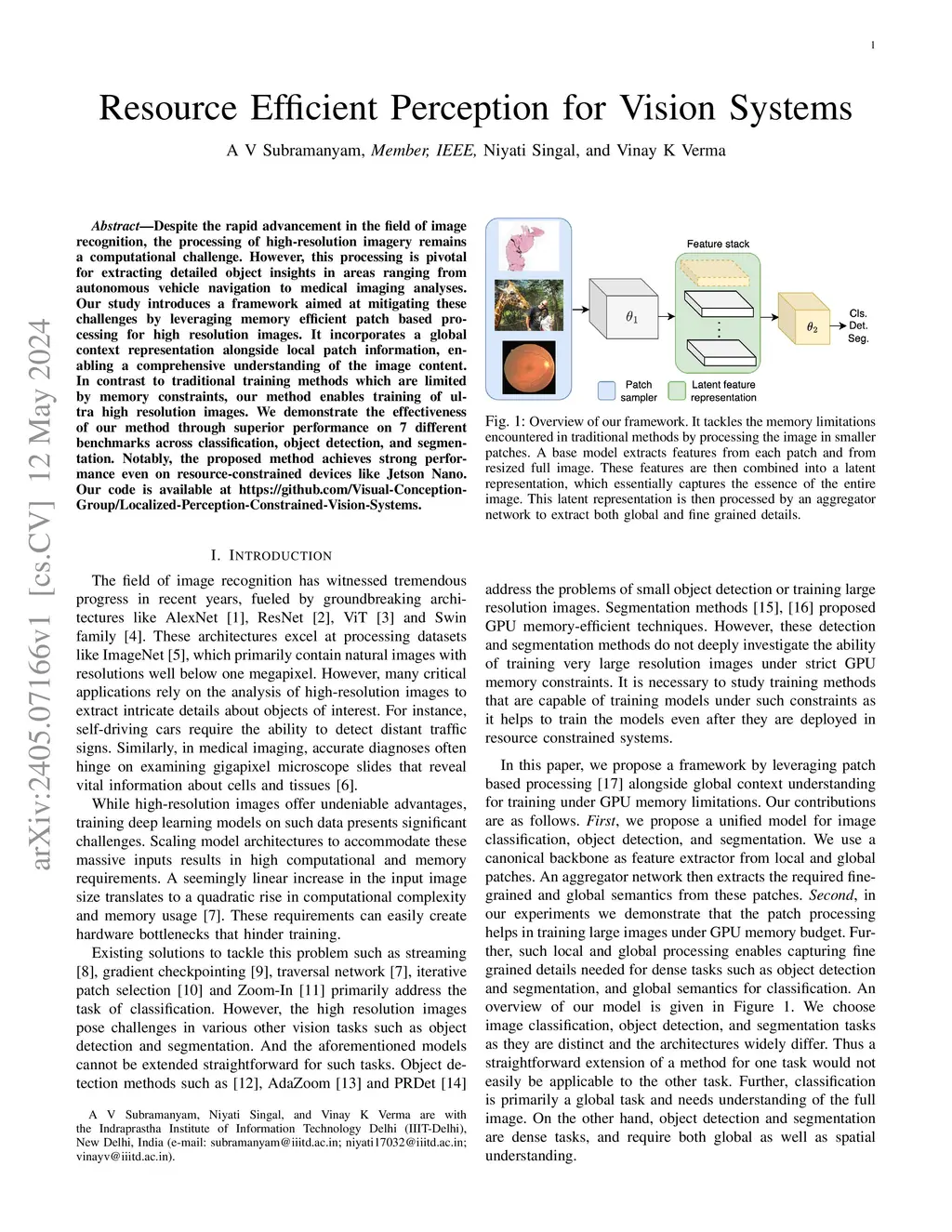 Despite the rapid advancement in the field of image recognition, the processing of high-resolution imagery remains a computational challenge. However, this processing is pivotal for extracting detailed object insights in areas ranging from autonomous vehicle navigation to medical imaging analyses. Our study introduces a framework aimed at mitigating these challenges by leveraging memory efficient patch based processing for high resolution images. It incorporates a global context representation alongside local patch information, enabling a comprehensive understanding of the image content. In contrast to traditional training methods which are limited by memory constraints, our method enables training of ultra high resolution images. We demonstrate the effectiveness of our method through superior performance on 7 different benchmarks across classification, object detection, and segmentation. Notably, the proposed method achieves strong performance even on resource-constrained devices like Jetson Nano. Our code is available at https://github.com/Visual-Conception-Group/Localized-Perception-Constrained-Vision-Systems.