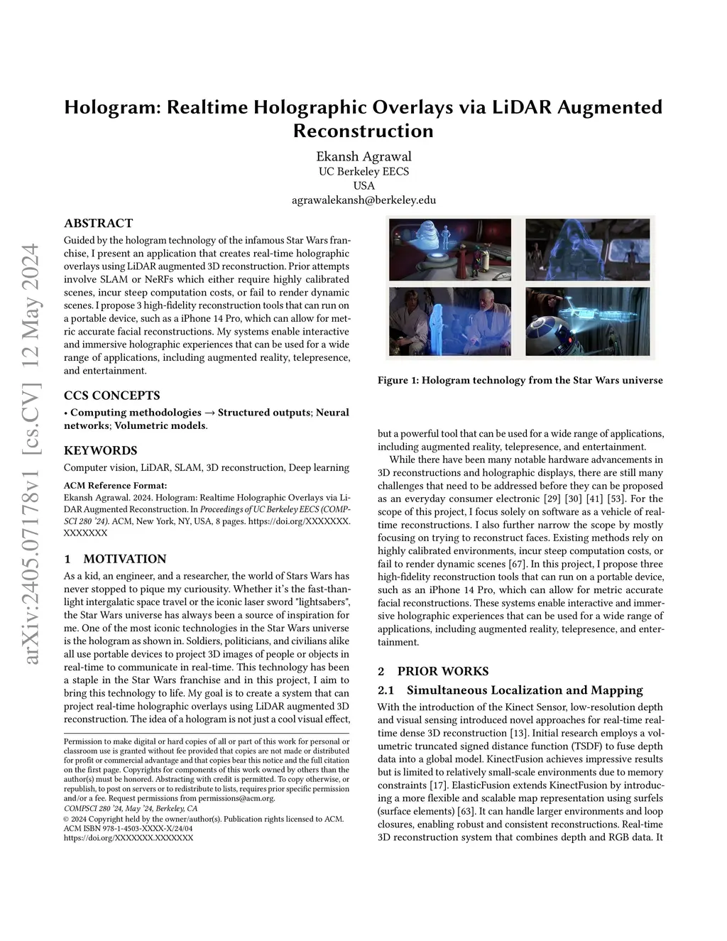 Guided by the hologram technology of the infamous Star Wars franchise, I present an application that creates real-time holographic overlays using LiDAR augmented 3D reconstruction. Prior attempts involve SLAM or NeRFs which either require highly calibrated scenes, incur steep computation costs, or fail to render dynamic scenes. I propose 3 high-fidelity reconstruction tools that can run on a portable device, such as a iPhone 14 Pro, which can allow for metric accurate facial reconstructions. My systems enable interactive and immersive holographic experiences that can be used for a wide range of applications, including augmented reality, telepresence, and entertainment.
