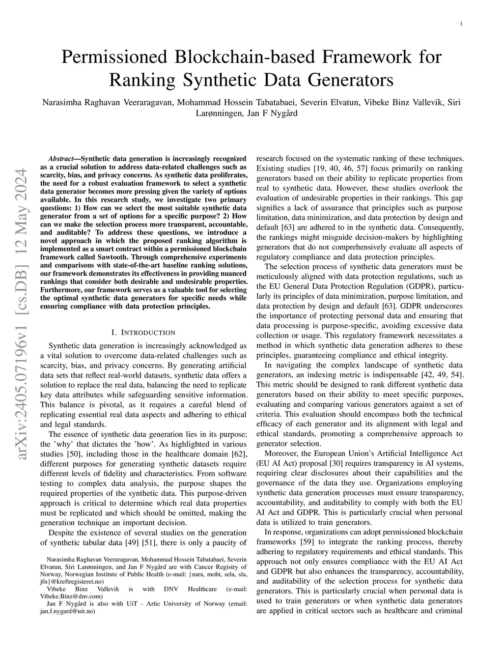 Permissioned Blockchain-based Framework for Ranking Synthetic Data