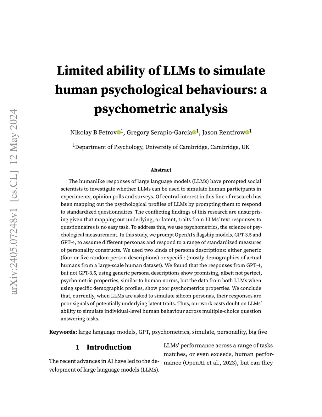 The humanlike responses of large language models (LLMs) have prompted social scientists to investigate whether LLMs can be used to simulate human participants in experiments, opinion polls and surveys. Of central interest in this line of research has been mapping out the psychological profiles of LLMs by prompting them to respond to standardized questionnaires. The conflicting findings of this research are unsurprising given that mapping out underlying, or latent, traits from LLMs' text responses to questionnaires is no easy task. To address this, we use psychometrics, the science of psychological measurement. In this study, we prompt OpenAI's flagship models, GPT-3.5 and GPT-4, to assume different personas and respond to a range of standardized measures of personality constructs. We used two kinds of persona descriptions: either generic (four or five random person descriptions) or specific (mostly demographics of actual humans from a large-scale human dataset). We found that the responses from GPT-4, but not GPT-3.5, using generic persona descriptions show promising, albeit not perfect, psychometric properties, similar to human norms, but the data from both LLMs when using specific demographic profiles, show poor psychometrics properties. We conclude that, currently, when LLMs are asked to simulate silicon personas, their responses are poor signals of potentially underlying latent traits. Thus, our work casts doubt on LLMs' ability to simulate individual-level human behaviour across multiple-choice question answering tasks.