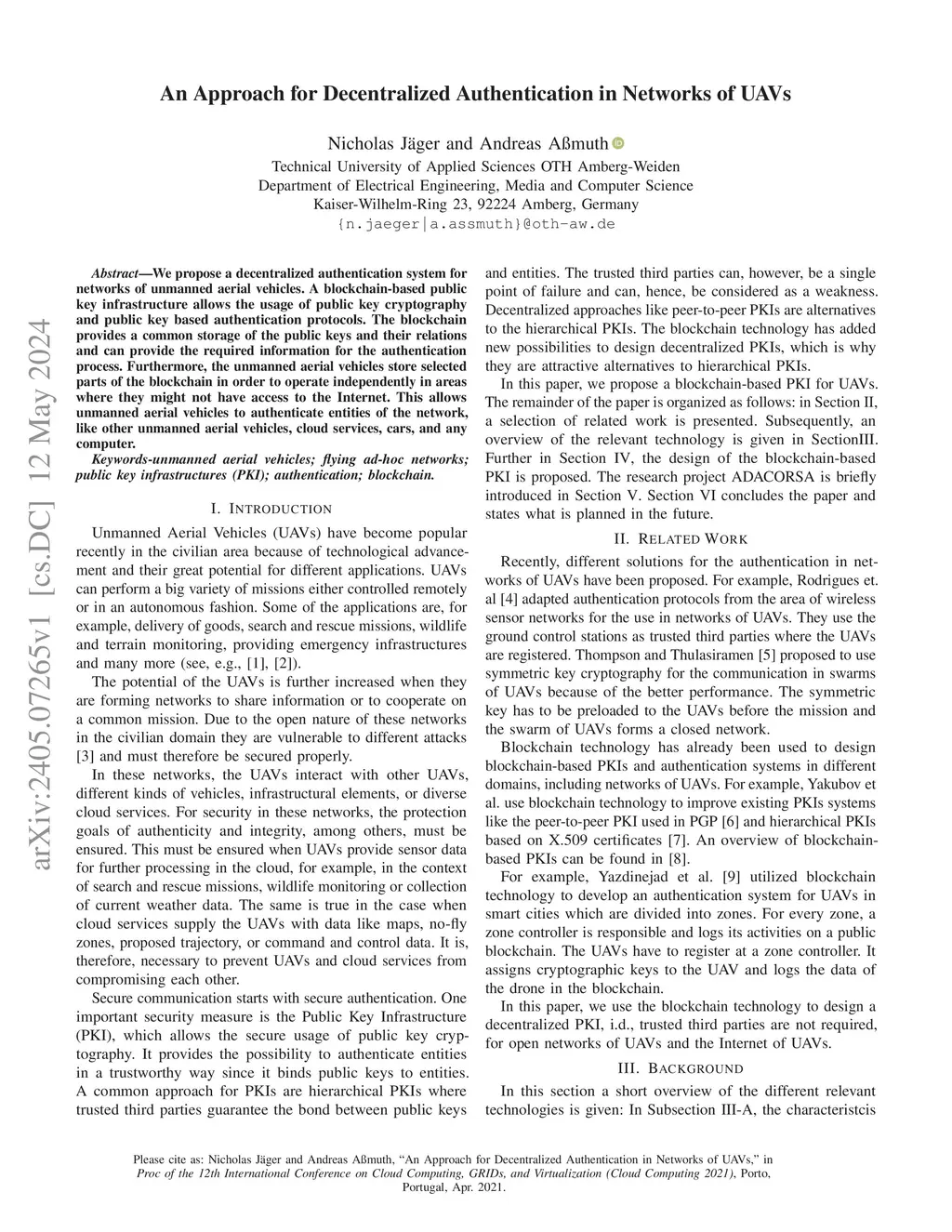 We propose a decentralized authentication system for networks of unmanned aerial vehicles. A blockchain-based public key infrastructure allows the usage of public key cryptography and public key based authentication protocols. The blockchain provides a common storage of the public keys and their relations and can provide the required information for the authentication process. Furthermore, the unmanned aerial vehicles store selected parts of the blockchain in order to operate independently in areas where they might not have access to the Internet. This allows unmanned aerial vehicles to authenticate entities of the network, like other unmanned aerial vehicles, cloud services, cars, and any computer.