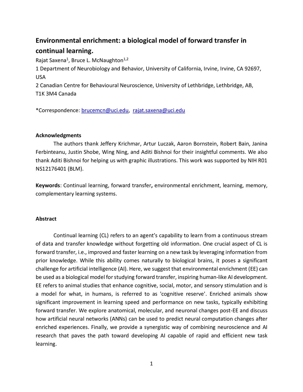 Continual learning (CL) refers to an agent's capability to learn from a continuous stream of data and transfer knowledge without forgetting old information. One crucial aspect of CL is forward transfer, i.e., improved and faster learning on a new task by leveraging information from prior knowledge. While this ability comes naturally to biological brains, it poses a significant challenge for artificial intelligence (AI). Here, we suggest that environmental enrichment (EE) can be used as a biological model for studying forward transfer, inspiring human-like AI development. EE refers to animal studies that enhance cognitive, social, motor, and sensory stimulation and is a model for what, in humans, is referred to as 'cognitive reserve'. Enriched animals show significant improvement in learning speed and performance on new tasks, typically exhibiting forward transfer. We explore anatomical, molecular, and neuronal changes post-EE and discuss how artificial neural networks (ANNs) can be used to predict neural computation changes after enriched experiences. Finally, we provide a synergistic way of combining neuroscience and AI research that paves the path toward developing AI capable of rapid and efficient new task learning.