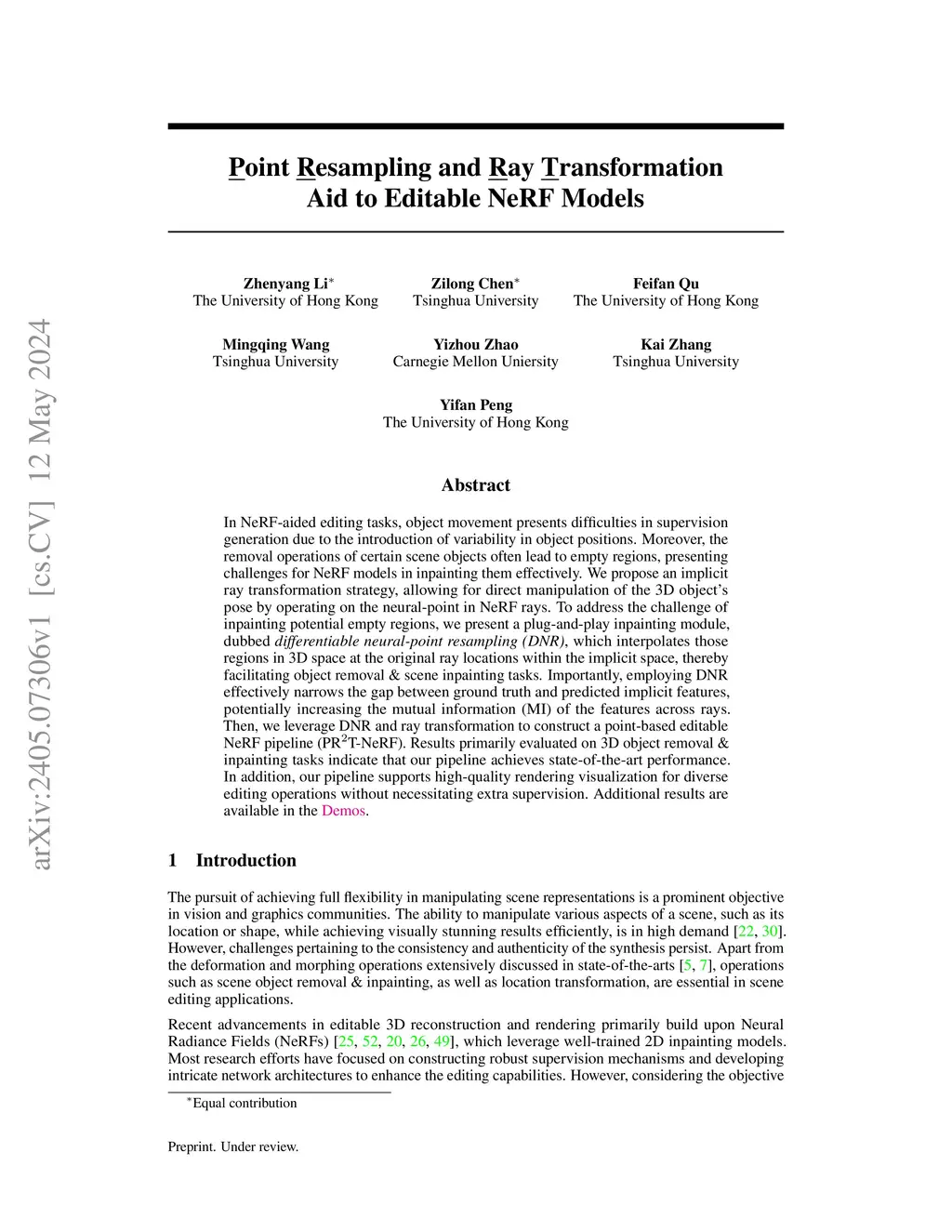 In NeRF-aided editing tasks, object movement presents difficulties in supervision generation due to the introduction of variability in object positions. Moreover, the removal operations of certain scene objects often lead to empty regions, presenting challenges for NeRF models in inpainting them effectively. We propose an implicit ray transformation strategy, allowing for direct manipulation of the 3D object's pose by operating on the neural-point in NeRF rays. To address the challenge of inpainting potential empty regions, we present a plug-and-play inpainting module, dubbed differentiable neural-point resampling (DNR), which interpolates those regions in 3D space at the original ray locations within the implicit space, thereby facilitating object removal & scene inpainting tasks. Importantly, employing DNR effectively narrows the gap between ground truth and predicted implicit features, potentially increasing the mutual information (MI) of the features across rays. Then, we leverage DNR and ray transformation to construct a point-based editable NeRF pipeline PR^2T-NeRF. Results primarily evaluated on 3D object removal & inpainting tasks indicate that our pipeline achieves state-of-the-art performance. In addition, our pipeline supports high-quality rendering visualization for diverse editing operations without necessitating extra supervision.