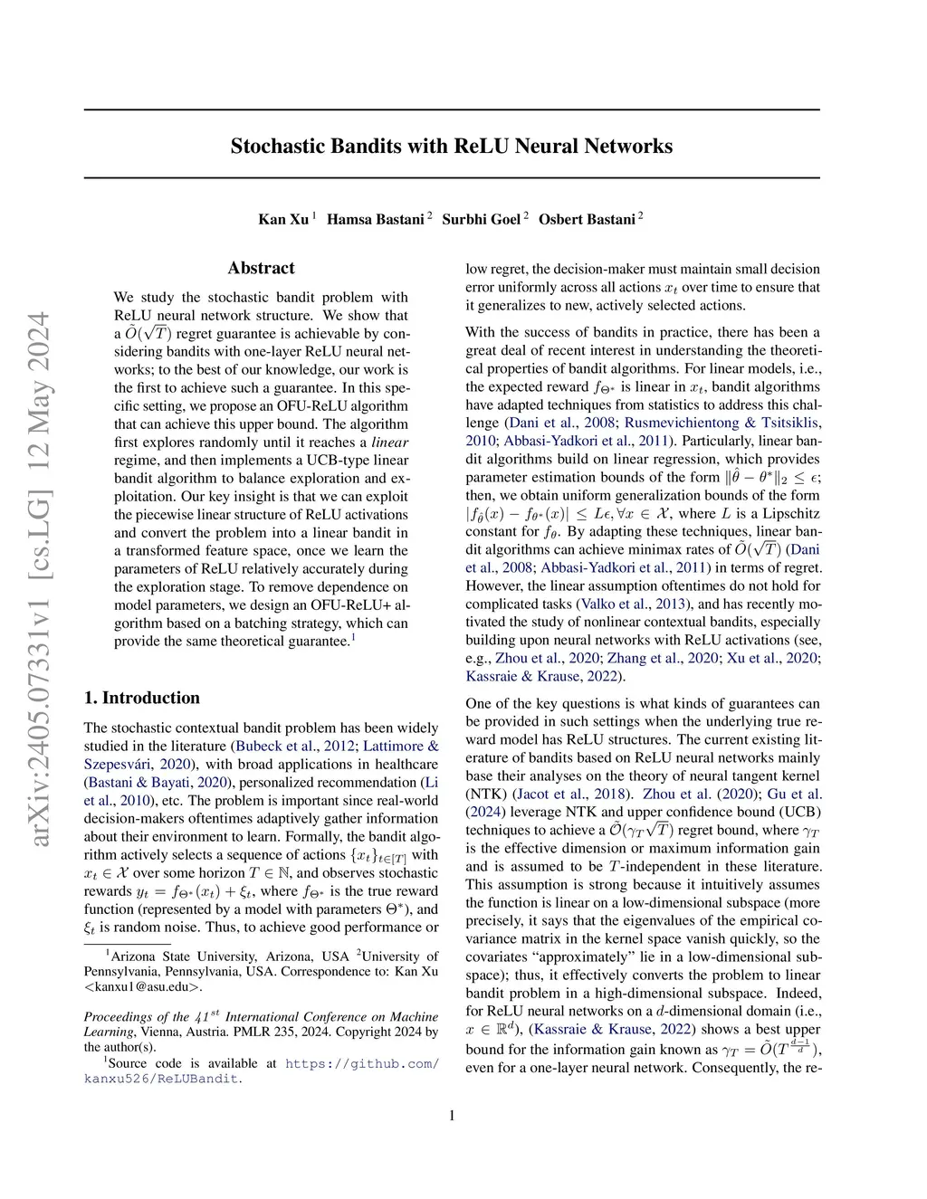 We study the stochastic bandit problem with ReLU neural network structure. We show that a regret guarantee is achievable by considering bandits with one-layer ReLU neural networks; to the best of our knowledge, our work is the first to achieve such a guarantee. In this specific setting, we propose an OFU-ReLU algorithm that can achieve this upper bound. The algorithm first explores randomly until it reaches a linear regime, and then implements a UCB-type linear bandit algorithm to balance exploration and exploitation. Our key insight is that we can exploit the piecewise linear structure of ReLU activations and convert the problem into a linear bandit in a transformed feature space, once we learn the parameters of ReLU relatively accurately during the exploration stage. To remove dependence on model parameters, we design an OFU-ReLU+ algorithm based on a batching strategy, which can provide the same theoretical guarantee.