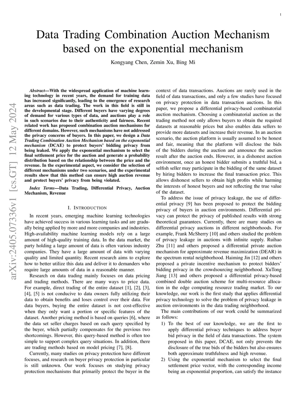 With the widespread application of machine learning technology in recent years, the demand for training data has increased significantly, leading to the emergence of research areas such as data trading. The work in this field is still in the developmental stage. Different buyers have varying degrees of demand for various types of data, and auctions play a role in such scenarios due to their authenticity and fairness. Recent related work has proposed combination auction mechanisms for different domains. However, such mechanisms have not addressed the privacy concerns of buyers. In this paper, we design a \textit{Data Trading Combination Auction Mechanism based on the exponential mechanism} (DCAE) to protect buyers' bidding privacy from being leaked. We apply the exponential mechanism to select the final settlement price for the auction and generate a probability distribution based on the relationship between the price and the revenue. In the experimental aspect, we consider the selection of different mechanisms under two scenarios, and the experimental results show that this method can ensure high auction revenue and protect buyers' privacy from being violated.