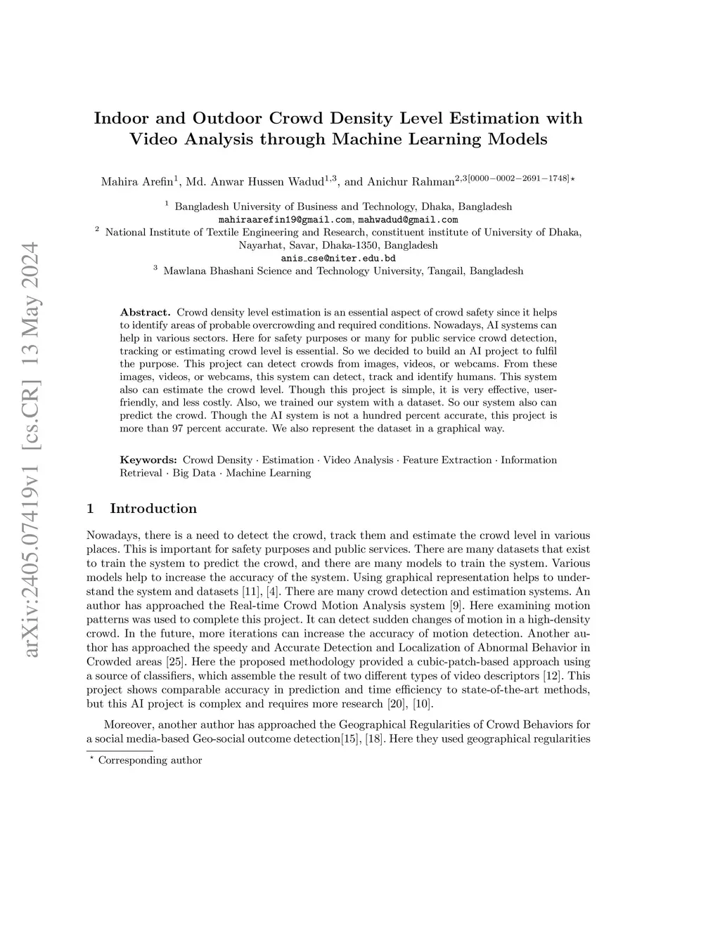 Crowd density level estimation is an essential aspect of crowd safety since it helps to identify areas of probable overcrowding and required conditions. Nowadays, AI systems can help in various sectors. Here for safety purposes or many for public service crowd detection, tracking or estimating crowd level is essential. So we decided to build an AI project to fulfil the purpose. This project can detect crowds from images, videos, or webcams. From these images, videos, or webcams, this system can detect, track and identify humans. This system also can estimate the crowd level. Though this project is simple, it is very effective, user-friendly, and less costly. Also, we trained our system with a dataset. So our system also can predict the crowd. Though the AI system is not a hundred percent accurate, this project is more than 97 percent accurate. We also represent the dataset in a graphical way.