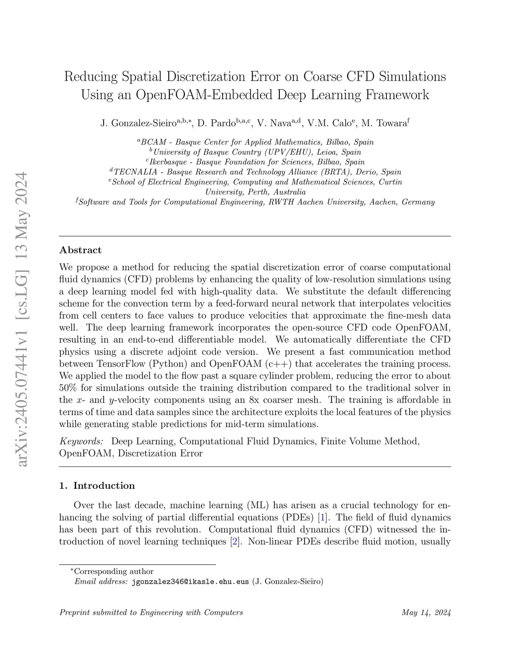 We propose a method for reducing the spatial discretization error of coarse computational fluid dynamics (CFD) problems by enhancing the quality of low-resolution simulations using a deep learning model fed with high-quality data. We substitute the default differencing scheme for the convection term by a feed-forward neural network that interpolates velocities from cell centers to face values to produce velocities that approximate the fine-mesh data well. The deep learning framework incorporates the open-source CFD code OpenFOAM, resulting in an end-to-end differentiable model. We automatically differentiate the CFD physics using a discrete adjoint code version. We present a fast communication method between TensorFlow (Python) and OpenFOAM (c++) that accelerates the training process. We applied the model to the flow past a square cylinder problem, reducing the error to about 50% for simulations outside the training distribution compared to the traditional solver in the x- and y-velocity components using an 8x coarser mesh. The training is affordable in terms of time and data samples since the architecture exploits the local features of the physics while generating stable predictions for mid-term simulations.