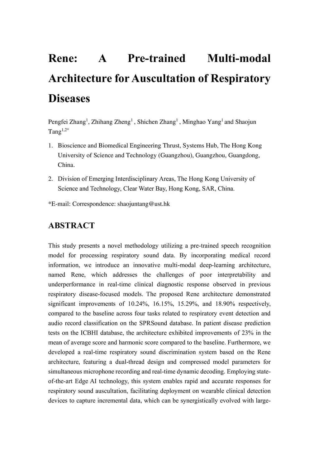Compared with invasive examinations that require tissue sampling, respiratory sound testing is a non-invasive examination method that is safer and easier for patients to accept. In this study, we introduce Rene, a pioneering large-scale model tailored for respiratory sound recognition. Rene has been rigorously fine-tuned with an extensive dataset featuring a broad array of respiratory audio samples, targeting disease detection, sound pattern classification, and event identification. Our innovative approach applies a pre-trained speech recognition model to process respiratory sounds, augmented with patient medical records. The resulting multi-modal deep-learning framework addresses interpretability and real-time diagnostic challenges that have hindered previous respiratory-focused models. Benchmark comparisons reveal that Rene significantly outperforms existing models, achieving improvements of 10.27%, 16.15%, 15.29%, and 18.90% in respiratory event detection and audio classification on the SPRSound database. Disease prediction accuracy on the ICBHI database improved by 23% over the baseline in both mean average and harmonic scores. Moreover, we have developed a real-time respiratory sound discrimination system utilizing the Rene architecture. Employing state-of-the-art Edge AI technology, this system enables rapid and accurate responses for respiratory sound auscultation(https://github.com/zpforlove/Rene).