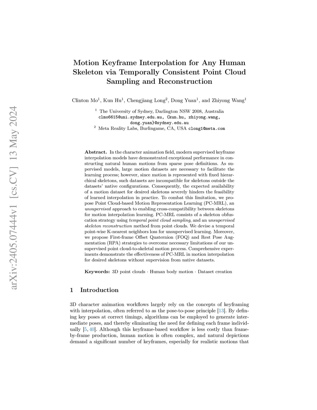 Motion Keyframe Interpolation for Any Human Skeleton via Temporally Consistent Point Cloud Sampling and Reconstruction