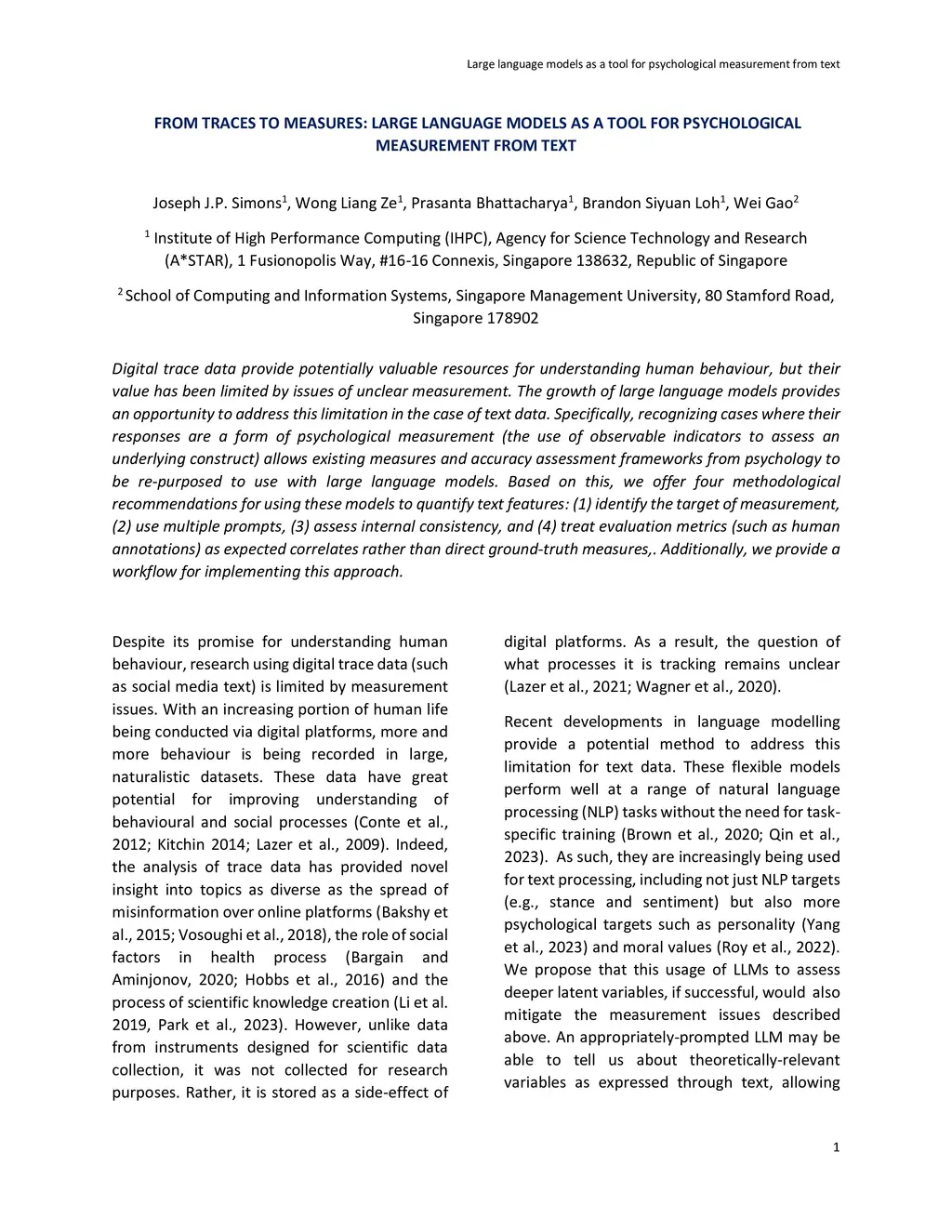 Digital trace data provide potentially valuable resources for understanding human behaviour, but their value has been limited by issues of unclear measurement. The growth of large language models provides an opportunity to address this limitation in the case of text data. Specifically, recognizing cases where their responses are a form of psychological measurement (the use of observable indicators to assess an underlying construct) allows existing measures and accuracy assessment frameworks from psychology to be re-purposed to use with large language models. Based on this, we offer four methodological recommendations for using these models to quantify text features: (1) identify the target of measurement, (2) use multiple prompts, (3) assess internal consistency, and (4) treat evaluation metrics (such as human annotations) as expected correlates rather than direct ground-truth measures. Additionally, we provide a workflow for implementing this approach.