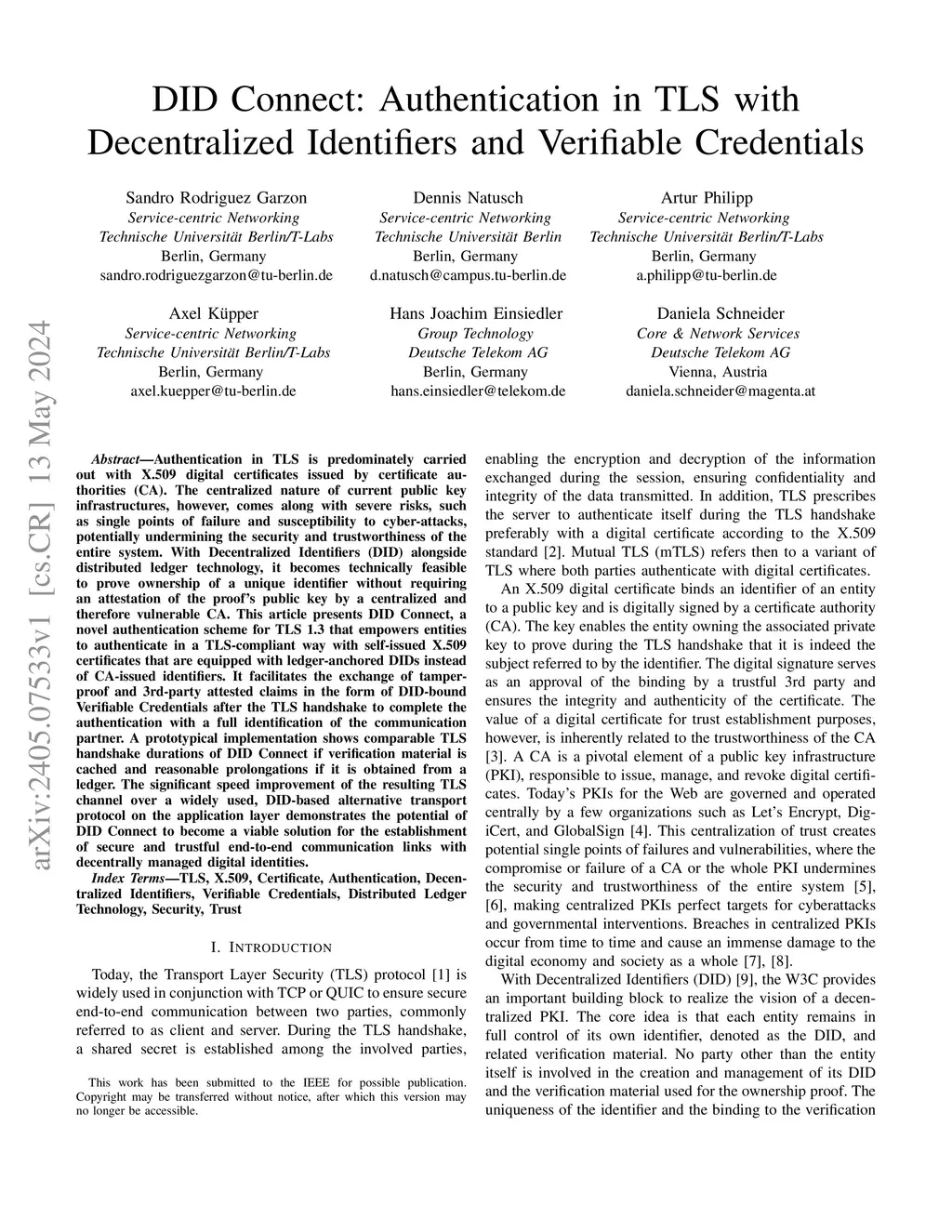 Authentication in TLS is predominately carried out with X.509 digital certificates issued by certificate authorities (CA). The centralized nature of current public key infrastructures, however, comes along with severe risks, such as single points of failure and susceptibility to cyber-attacks, potentially undermining the security and trustworthiness of the entire system. With Decentralized Identifiers (DID) alongside distributed ledger technology, it becomes technically feasible to prove ownership of a unique identifier without requiring an attestation of the proof's public key by a centralized and therefore vulnerable CA. This article presents DID Link, a novel authentication scheme for TLS 1.3 that empowers entities to authenticate in a TLS-compliant way with self-issued X.509 certificates that are equipped with ledger-anchored DIDs instead of CA-issued identifiers. It facilitates the exchange of tamper-proof and 3rd-party attested claims in the form of DID-bound Verifiable Credentials after the TLS handshake to complete the authentication with a full identification of the communication partner. A prototypical implementation shows comparable TLS handshake durations of DID Link if verification material is cached and reasonable prolongations if it is obtained from a ledger. The significant speed improvement of the resulting TLS channel over a widely used, DID-based alternative transport protocol on the application layer demonstrates the potential of DID Link to become a viable solution for the establishment of secure and trustful end-to-end communication links with decentrally managed digital identities.