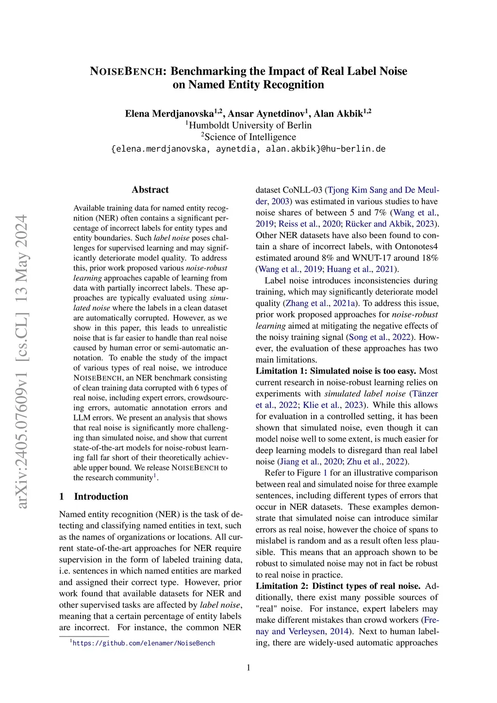 Available training data for named entity recognition (NER) often contains a significant percentage of incorrect labels for entity types and entity boundaries. Such label noise poses challenges for supervised learning and may significantly deteriorate model quality. To address this, prior work proposed various noise-robust learning approaches capable of learning from data with partially incorrect labels. These approaches are typically evaluated using simulated noise where the labels in a clean dataset are automatically corrupted. However, as we show in this paper, this leads to unrealistic noise that is far easier to handle than real noise caused by human error or semi-automatic annotation. To enable the study of the impact of various types of real noise, we introduce NoiseBench, an NER benchmark consisting of clean training data corrupted with 6 types of real noise, including expert errors, crowdsourcing errors, automatic annotation errors and LLM errors. We present an analysis that shows that real noise is significantly more challenging than simulated noise, and show that current state-of-the-art models for noise-robust learning fall far short of their theoretically achievable upper bound. We release NoiseBench to the research community.