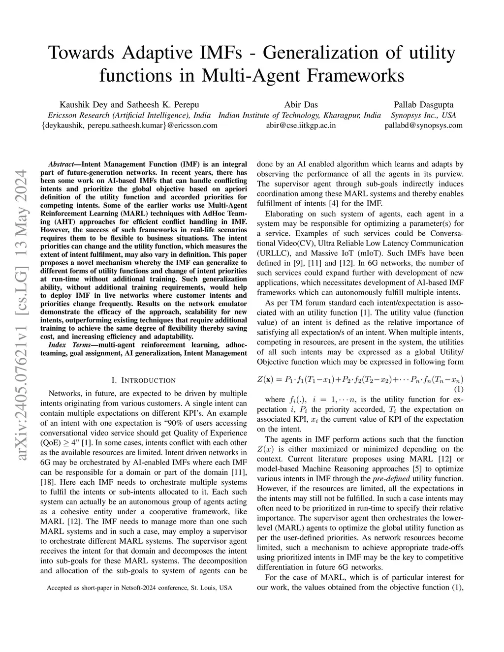 Intent Management Function (IMF) is an integral part of future-generation networks. In recent years, there has been some work on AI-based IMFs that can handle conflicting intents and prioritize the global objective based on apriori definition of the utility function and accorded priorities for competing intents. Some of the earlier works use Multi-Agent Reinforcement Learning (MARL) techniques with AdHoc Teaming (AHT) approaches for efficient conflict handling in IMF. However, the success of such frameworks in real-life scenarios requires them to be flexible to business situations. The intent priorities can change and the utility function, which measures the extent of intent fulfilment, may also vary in definition. This paper proposes a novel mechanism whereby the IMF can generalize to different forms of utility functions and change of intent priorities at run-time without additional training. Such generalization ability, without additional training requirements, would help to deploy IMF in live networks where customer intents and priorities change frequently. Results on the network emulator demonstrate the efficacy of the approach, scalability for new intents, outperforming existing techniques that require additional training to achieve the same degree of flexibility thereby saving cost, and increasing efficiency and adaptability.
