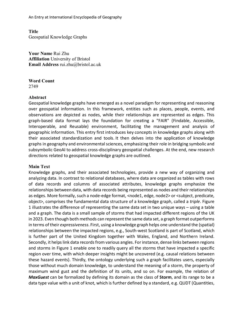 Geospatial knowledge graphs have emerged as a novel paradigm for representing and reasoning over geospatial information. In this framework, entities such as places, people, events, and observations are depicted as nodes, while their relationships are represented as edges. This graph-based data format lays the foundation for creating a "FAIR" (Findable, Accessible, Interoperable, and Reusable) environment, facilitating the management and analysis of geographic information. This entry first introduces key concepts in knowledge graphs along with their associated standardization and tools. It then delves into the application of knowledge graphs in geography and environmental sciences, emphasizing their role in bridging symbolic and subsymbolic GeoAI to address cross-disciplinary geospatial challenges. At the end, new research directions related to geospatial knowledge graphs are outlined.
