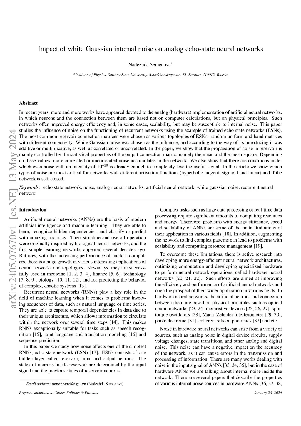 In recent years, more and more works have appeared devoted to the analog (hardware) implementation of artificial neural networks, in which neurons and the connection between them are based not on computer calculations, but on physical principles. Such networks offer improved energy efficiency and, in some cases, scalability, but may be susceptible to internal noise. This paper studies the influence of noise on the functioning of recurrent networks using the example of trained echo state networks (ESNs). The most common reservoir connection matrices were chosen as various topologies of ESNs: random uniform and band matrices with different connectivity. White Gaussian noise was chosen as the influence, and according to the way of its introducing it was additive or multiplicative, as well as correlated or uncorrelated. In the paper, we show that the propagation of noise in reservoir is mainly controlled by the statistical properties of the output connection matrix, namely the mean and the mean square. Depending on these values, more correlated or uncorrelated noise accumulates in the network. We also show that there are conditions under which even noise with an intensity of is already enough to completely lose the useful signal. In the article we show which types of noise are most critical for networks with different activation functions (hyperbolic tangent, sigmoid and linear) and if the network is self-closed.