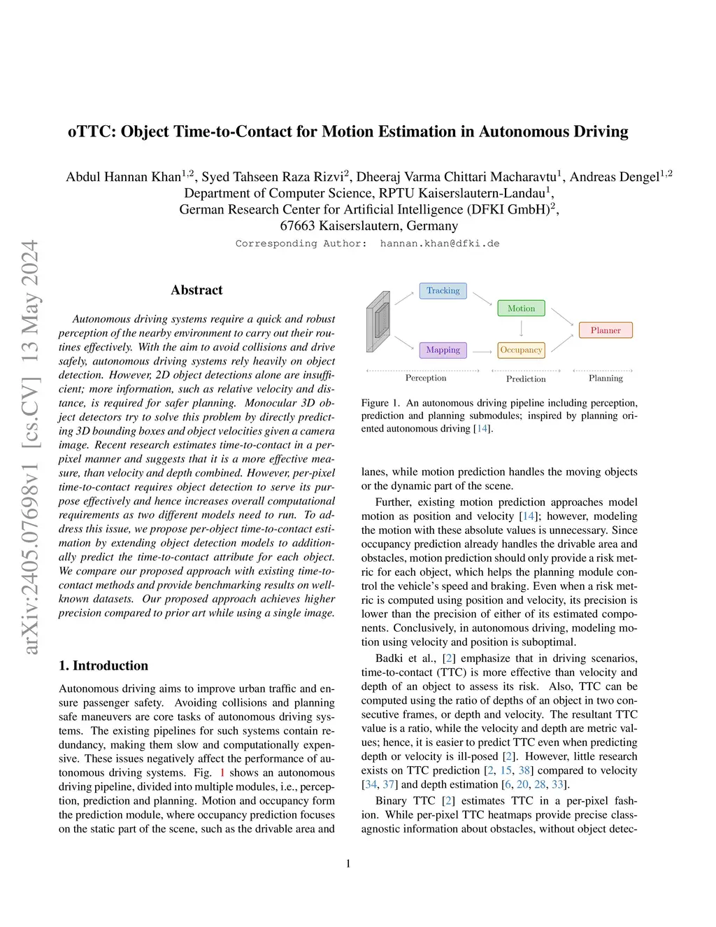 oTTC: Object Time-to-Contact for Motion Estimation in Autonomous Driving