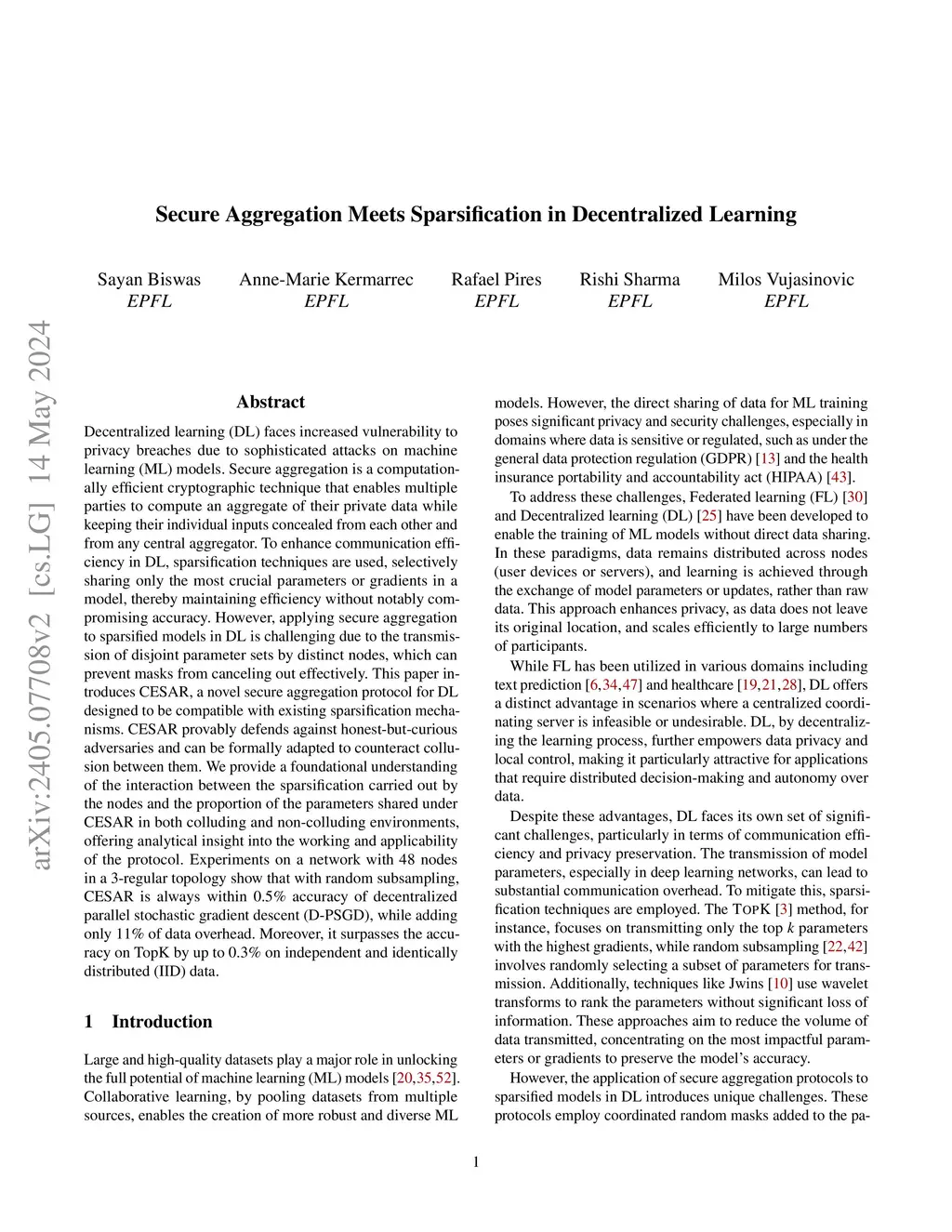 Decentralized learning (DL) faces increased vulnerability to privacy breaches due to sophisticated attacks on machine learning (ML) models. Secure aggregation is a computationally efficient cryptographic technique that enables multiple parties to compute an aggregate of their private data while keeping their individual inputs concealed from each other and from any central aggregator. To enhance communication efficiency in DL, sparsification techniques are used, selectively sharing only the most crucial parameters or gradients in a model, thereby maintaining efficiency without notably compromising accuracy. However, applying secure aggregation to sparsified models in DL is challenging due to the transmission of disjoint parameter sets by distinct nodes, which can prevent masks from canceling out effectively. This paper introduces CESAR, a novel secure aggregation protocol for DL designed to be compatible with existing sparsification mechanisms. CESAR provably defends against honest-but-curious adversaries and can be formally adapted to counteract collusion between them. We provide a foundational understanding of the interaction between the sparsification carried out by the nodes and the proportion of the parameters shared under CESAR in both colluding and non-colluding environments, offering analytical insight into the working and applicability of the protocol. Experiments on a network with 48 nodes in a 3-regular topology show that with random subsampling, CESAR is always within 0.5% accuracy of decentralized parallel stochastic gradient descent (D-PSGD), while adding only 11% of data overhead. Moreover, it surpasses the accuracy on TopK by up to 0.3% on independent and identically distributed (IID) data.