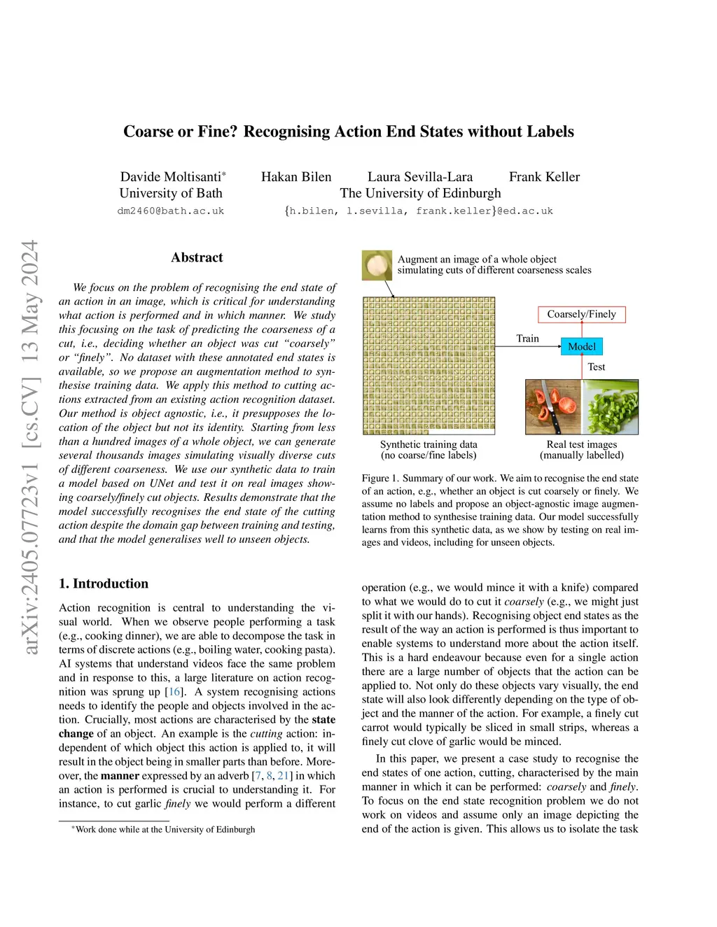 We focus on the problem of recognising the end state of an action in an image, which is critical for understanding what action is performed and in which manner. We study this focusing on the task of predicting the coarseness of a cut, i.e., deciding whether an object was cut "coarsely" or "finely". No dataset with these annotated end states is available, so we propose an augmentation method to synthesise training data. We apply this method to cutting actions extracted from an existing action recognition dataset. Our method is object agnostic, i.e., it presupposes the location of the object but not its identity. Starting from less than a hundred images of a whole object, we can generate several thousands images simulating visually diverse cuts of different coarseness. We use our synthetic data to train a model based on UNet and test it on real images showing coarsely/finely cut objects. Results demonstrate that the model successfully recognises the end state of the cutting action despite the domain gap between training and testing, and that the model generalises well to unseen objects.