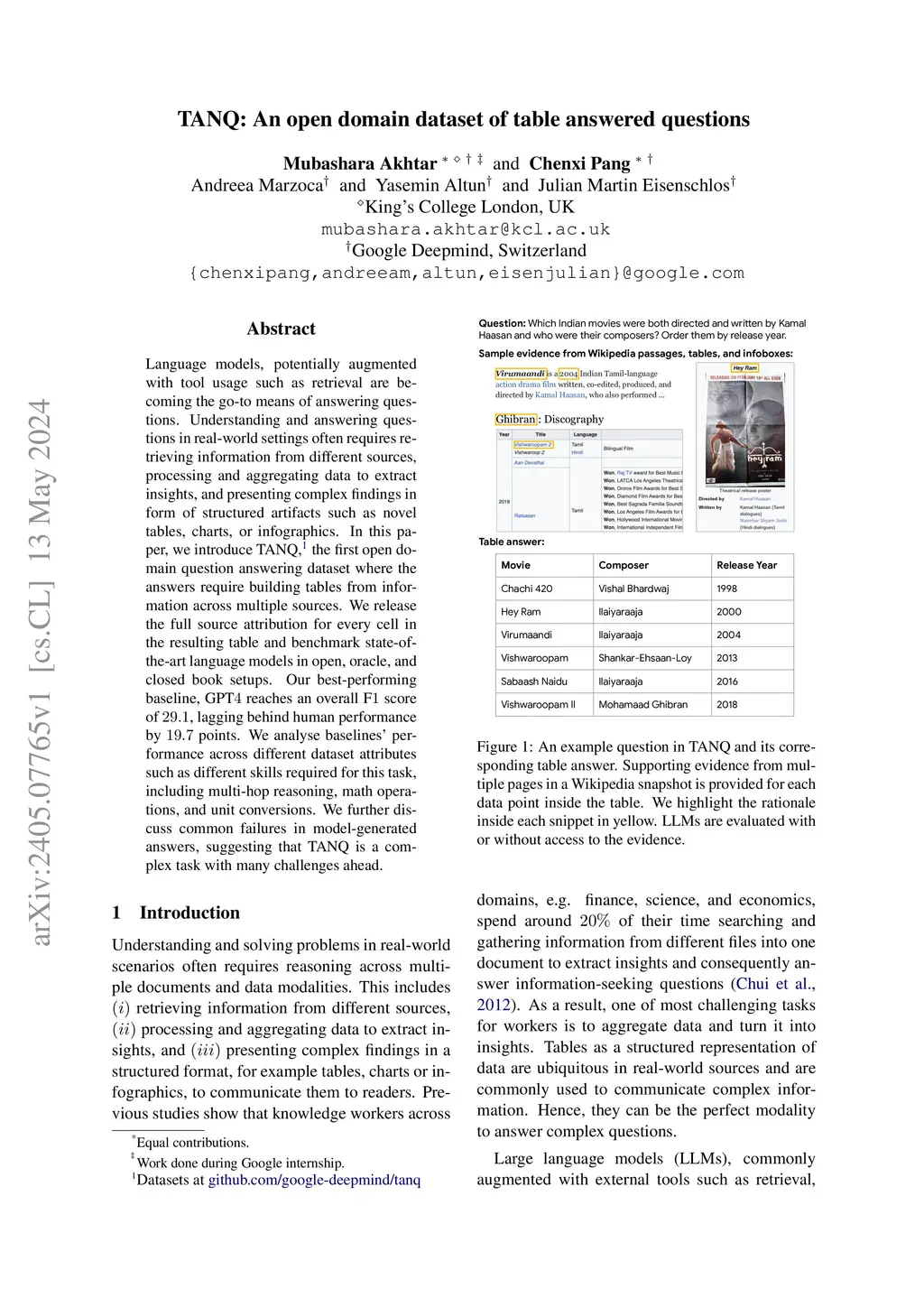 TANQ: An open domain dataset of table answered questions
