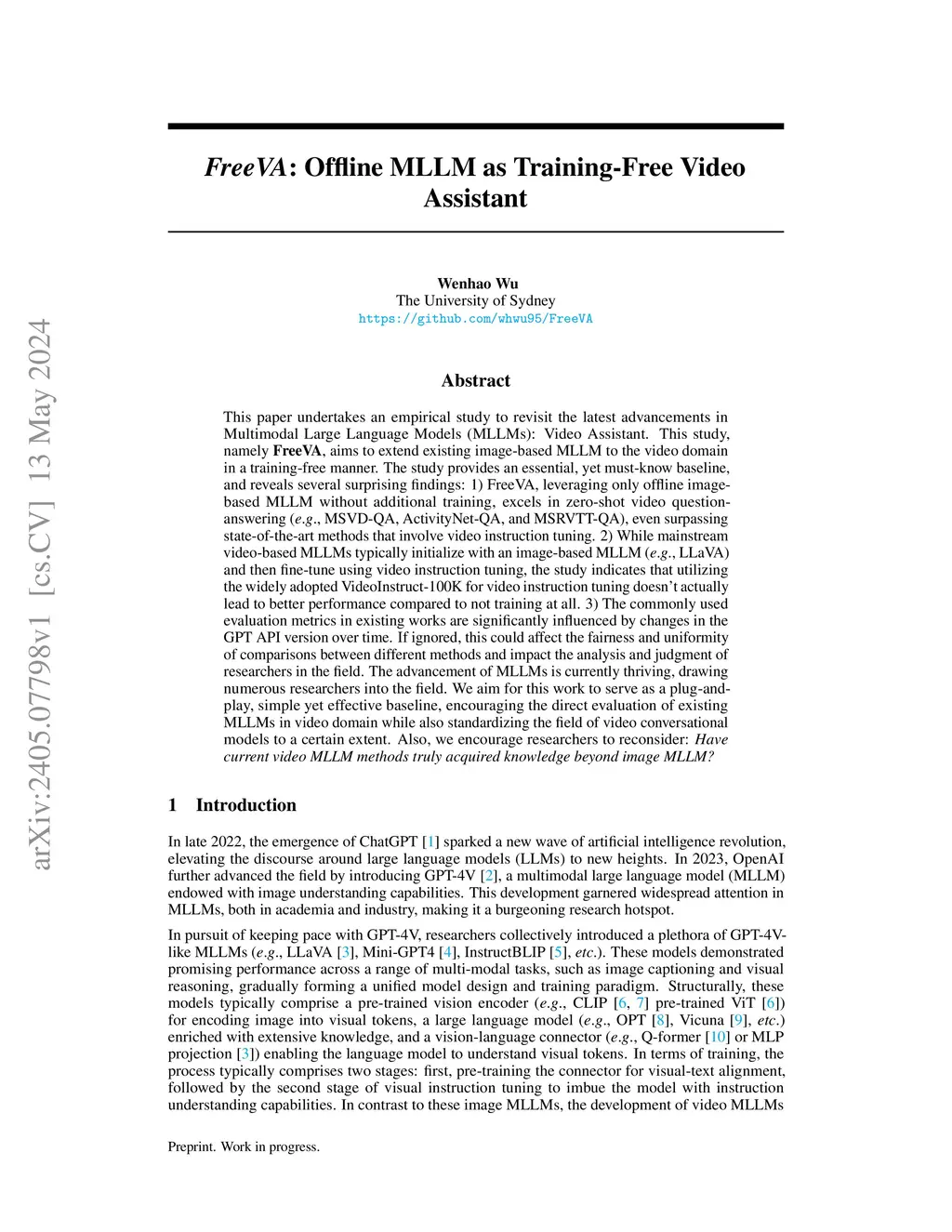 This paper undertakes an empirical study to revisit the latest advancements in Multimodal Large Language Models (MLLMs): Video Assistant. This study, namely FreeVA, aims to extend existing image-based MLLM to the video domain in a training-free manner. The study provides an essential, yet must-know baseline, and reveals several surprising findings: 1) FreeVA, leveraging only offline image-based MLLM without additional training, excels in zero-shot video question-answering (e.g., MSVD-QA, ActivityNet-QA, and MSRVTT-QA), even surpassing state-of-the-art methods that involve video instruction tuning. 2) While mainstream video-based MLLMs typically initialize with an image-based MLLM (e.g., LLaVA) and then fine-tune using video instruction tuning, the study indicates that utilizing the widely adopted VideoInstruct-100K for video instruction tuning doesn't actually lead to better performance compared to not training at all. 3) The commonly used evaluation metrics in existing works are significantly influenced by changes in the GPT API version over time. If ignored, this could affect the fairness and uniformity of comparisons between different methods and impact the analysis and judgment of researchers in the field. The advancement of MLLMs is currently thriving, drawing numerous researchers into the field. We aim for this work to serve as a plug-and-play, simple yet effective baseline, encouraging the direct evaluation of existing MLLMs in video domain while also standardizing the field of video conversational models to a certain extent. Also, we encourage researchers to reconsider: Have current video MLLM methods truly acquired knowledge beyond image MLLM? Code is available at https://github.com/whwu95/FreeVA