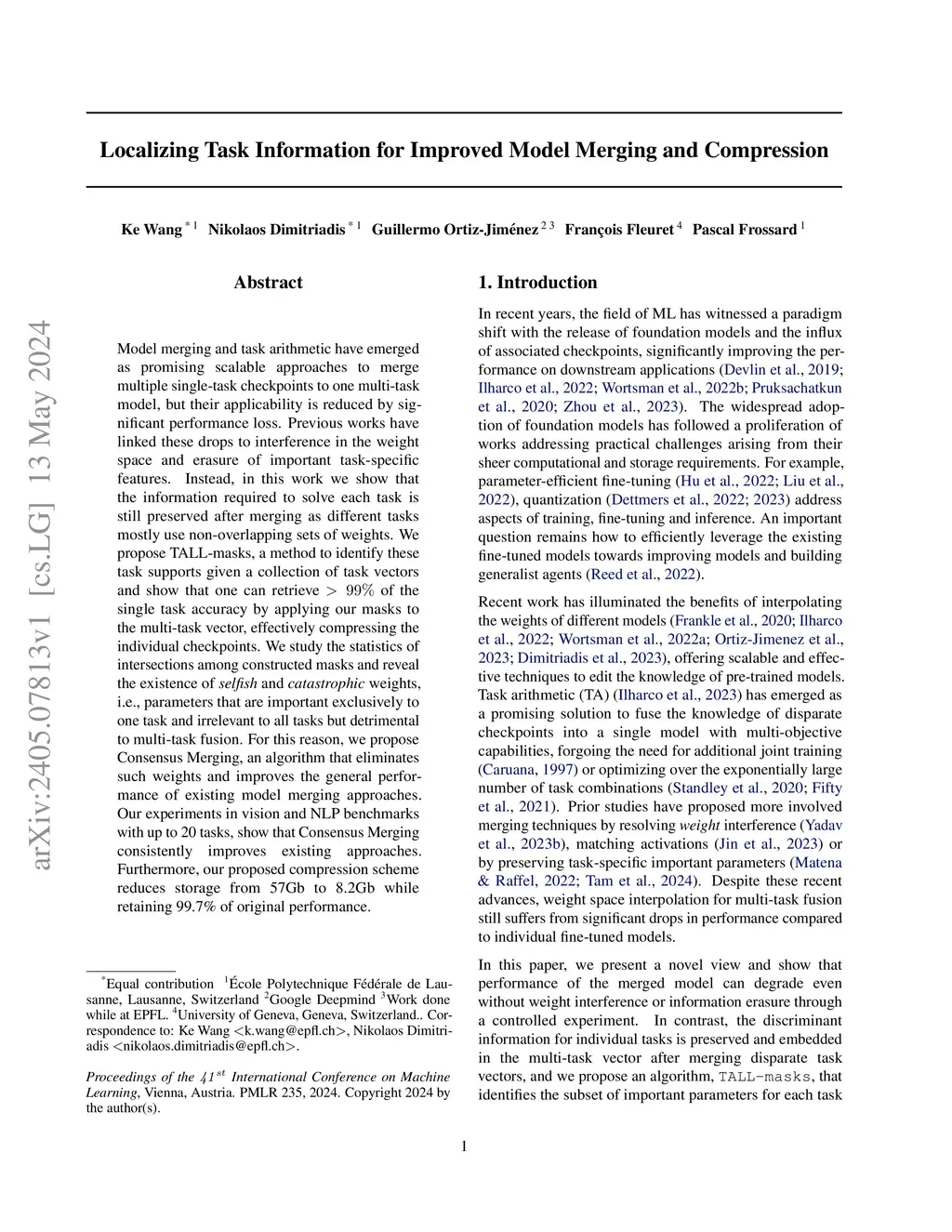 Model merging and task arithmetic have emerged as promising scalable approaches to merge multiple single-task checkpoints to one multi-task model, but their applicability is reduced by significant performance loss. Previous works have linked these drops to interference in the weight space and erasure of important task-specific features. Instead, in this work we show that the information required to solve each task is still preserved after merging as different tasks mostly use non-overlapping sets of weights. We propose TALL-masks, a method to identify these task supports given a collection of task vectors and show that one can retrieve >99% of the single task accuracy by applying our masks to the multi-task vector, effectively compressing the individual checkpoints. We study the statistics of intersections among constructed masks and reveal the existence of selfish and catastrophic weights, i.e., parameters that are important exclusively to one task and irrelevant to all tasks but detrimental to multi-task fusion. For this reason, we propose Consensus Merging, an algorithm that eliminates such weights and improves the general performance of existing model merging approaches. Our experiments in vision and NLP benchmarks with up to 20 tasks, show that Consensus Merging consistently improves existing approaches. Furthermore, our proposed compression scheme reduces storage from 57Gb to 8.2Gb while retaining 99.7% of original performance.