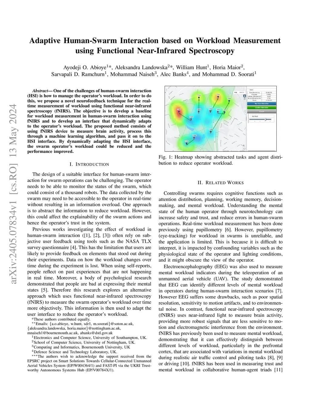 One of the challenges of human-swarm interaction (HSI) is how to manage the operator's workload. In order to do this, we propose a novel neurofeedback technique for the real-time measurement of workload using functional near-infrared spectroscopy (fNIRS). The objective is to develop a baseline for workload measurement in human-swarm interaction using fNIRS and to develop an interface that dynamically adapts to the operator's workload. The proposed method consists of using fNIRS device to measure brain activity, process this through a machine learning algorithm, and pass it on to the HSI interface. By dynamically adapting the HSI interface, the swarm operator's workload could be reduced and the performance improved.