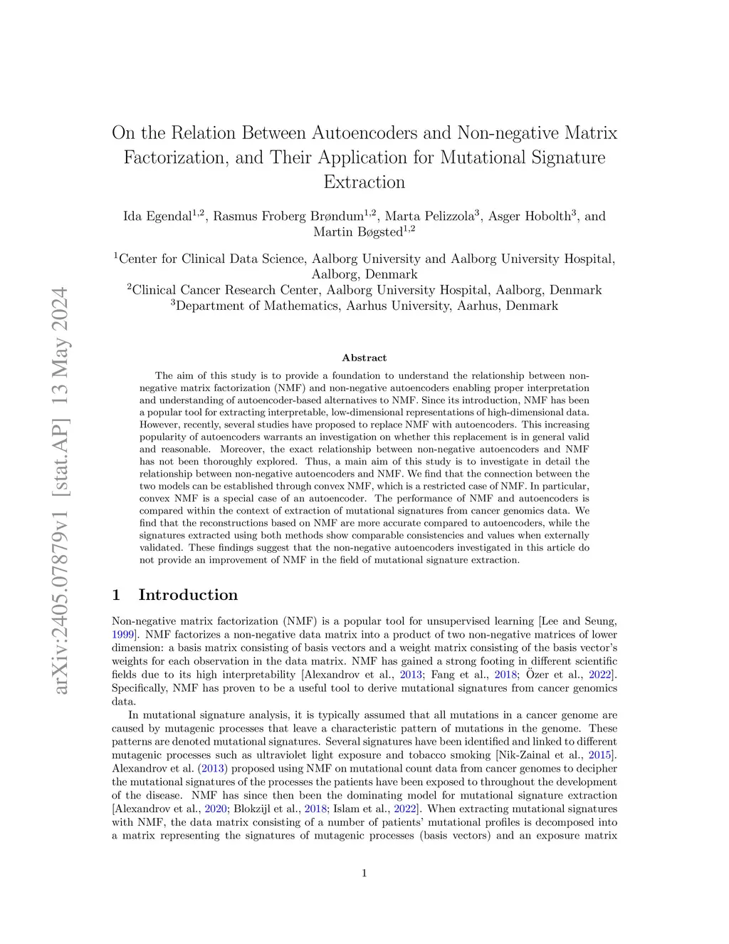 The aim of this study is to provide a foundation to understand the relationship between non-negative matrix factorization (NMF) and non-negative autoencoders enabling proper interpretation and understanding of autoencoder-based alternatives to NMF. Since its introduction, NMF has been a popular tool for extracting interpretable, low-dimensional representations of high-dimensional data. However, recently, several studies have proposed to replace NMF with autoencoders. This increasing popularity of autoencoders warrants an investigation on whether this replacement is in general valid and reasonable. Moreover, the exact relationship between non-negative autoencoders and NMF has not been thoroughly explored. Thus, a main aim of this study is to investigate in detail the relationship between non-negative autoencoders and NMF. We find that the connection between the two models can be established through convex NMF, which is a restricted case of NMF. In particular, convex NMF is a special case of an autoencoder. The performance of NMF and autoencoders is compared within the context of extraction of mutational signatures from cancer genomics data. We find that the reconstructions based on NMF are more accurate compared to autoencoders, while the signatures extracted using both methods show comparable consistencies and values when externally validated. These findings suggest that the non-negative autoencoders investigated in this article do not provide an improvement of NMF in the field of mutational signature extraction.