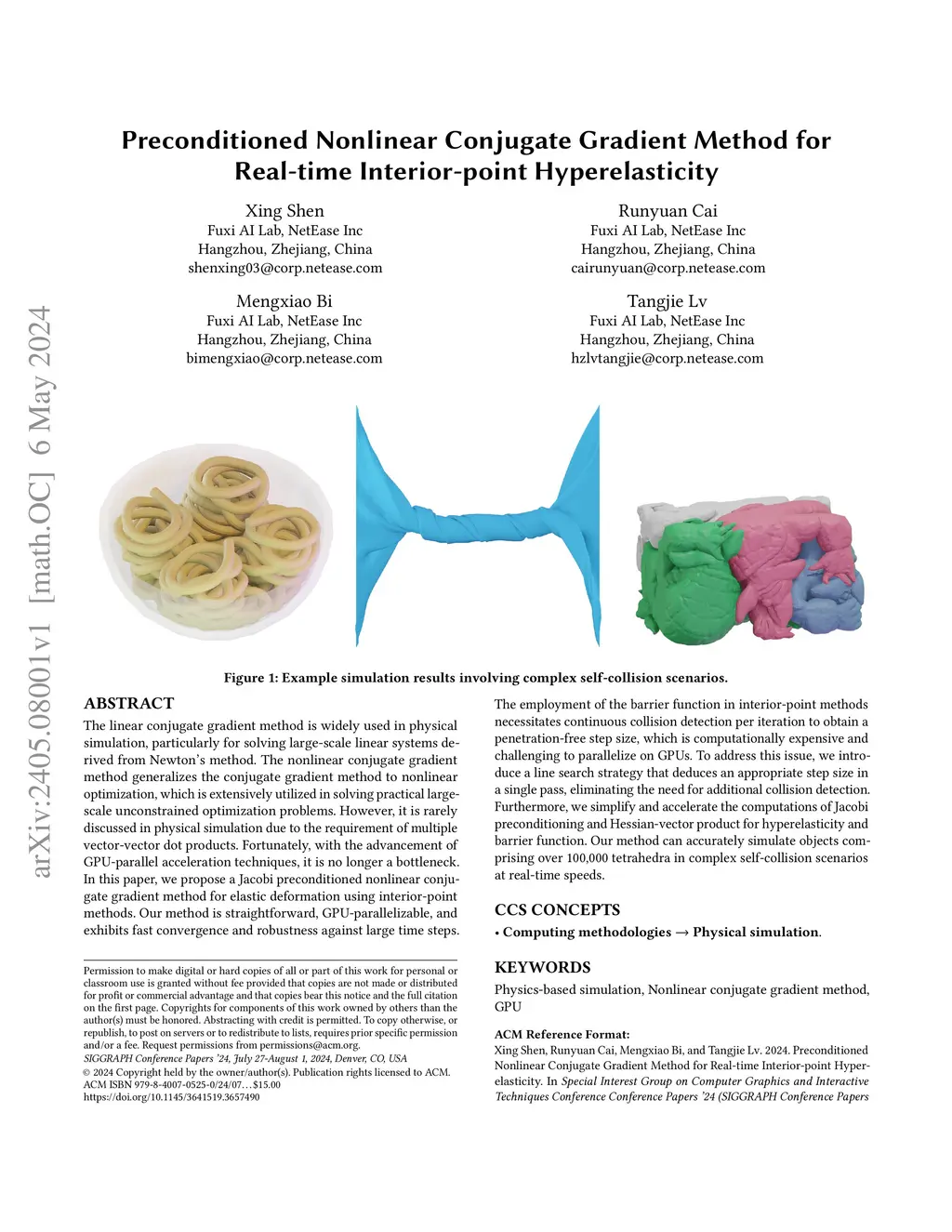 The linear conjugate gradient method is widely used in physical simulation, particularly for solving large-scale linear systems derived from Newton's method. The nonlinear conjugate gradient method generalizes the conjugate gradient method to nonlinear optimization, which is extensively utilized in solving practical large-scale unconstrained optimization problems. However, it is rarely discussed in physical simulation due to the requirement of multiple vector-vector dot products. Fortunately, with the advancement of GPU-parallel acceleration techniques, it is no longer a bottleneck. In this paper, we propose a Jacobi preconditioned nonlinear conjugate gradient method for elastic deformation using interior-point methods. Our method is straightforward, GPU-parallelizable, and exhibits fast convergence and robustness against large time steps. The employment of the barrier function in interior-point methods necessitates continuous collision detection per iteration to obtain a penetration-free step size, which is computationally expensive and challenging to parallelize on GPUs. To address this issue, we introduce a line search strategy that deduces an appropriate step size in a single pass, eliminating the need for additional collision detection. Furthermore, we simplify and accelerate the computations of Jacobi preconditioning and Hessian-vector product for hyperelasticity and barrier function. Our method can accurately simulate objects comprising over 100,000 tetrahedra in complex self-collision scenarios at real-time speeds.