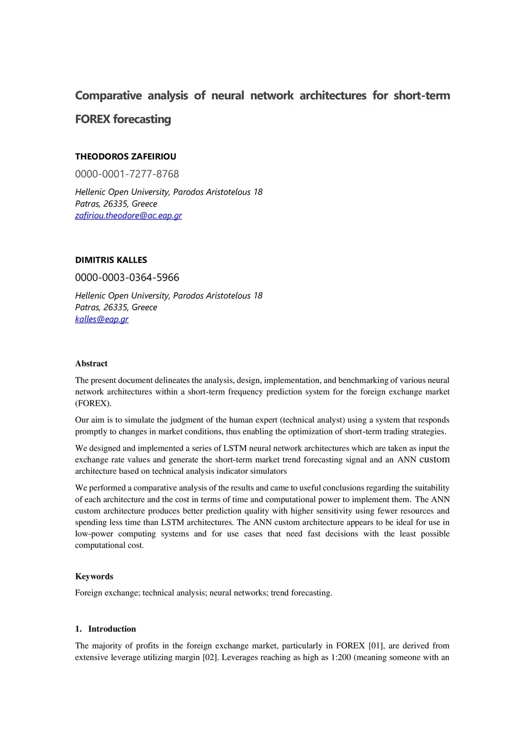 The present document delineates the analysis, design, implementation, and benchmarking of various neural network architectures within a short-term frequency prediction system for the foreign exchange market (FOREX). Our aim is to simulate the judgment of the human expert (technical analyst) using a system that responds promptly to changes in market conditions, thus enabling the optimization of short-term trading strategies. We designed and implemented a series of LSTM neural network architectures which are taken as input the exchange rate values and generate the short-term market trend forecasting signal and an ANN custom architecture based on technical analysis indicator simulators We performed a comparative analysis of the results and came to useful conclusions regarding the suitability of each architecture and the cost in terms of time and computational power to implement them. The ANN custom architecture produces better prediction quality with higher sensitivity using fewer resources and spending less time than LSTM architectures. The ANN custom architecture appears to be ideal for use in low-power computing systems and for use cases that need fast decisions with the least possible computational cost.